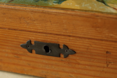 ★A&C15761 黄色い薔薇のモシュリンヌボックス W15.8,D11.5,H6.5cm / 送料:Aランク 【送料ページはこちら】 ◆ご注文方法はこちら◆ 黄色い薔薇と、勿忘草のブルーが引き立て合う、可憐な絵柄とともに、「A Present from Windsor」の文字が添えられた木箱。旅の思い出やお気に入りの品を、大切に取っておくために使ってほしい、味わいのあるひと品です。黄色い薔薇の花言葉に「友情」「平和」などあるそうで、しっかりと守ってくれそうでもあります。20世紀初頭のイギリス製。 プリントの細かなキズやが見られますが、経年の味わいとして好ましいものです。しっかりしており特に目立つダメージは見られません。内部も綺麗な状態です。鍵は無くり、蓋がロックしません。持ち上げるときは胴を持ってください。 味わいのある木箱達をご紹介しています。下部のリンクからご覧ください。 |