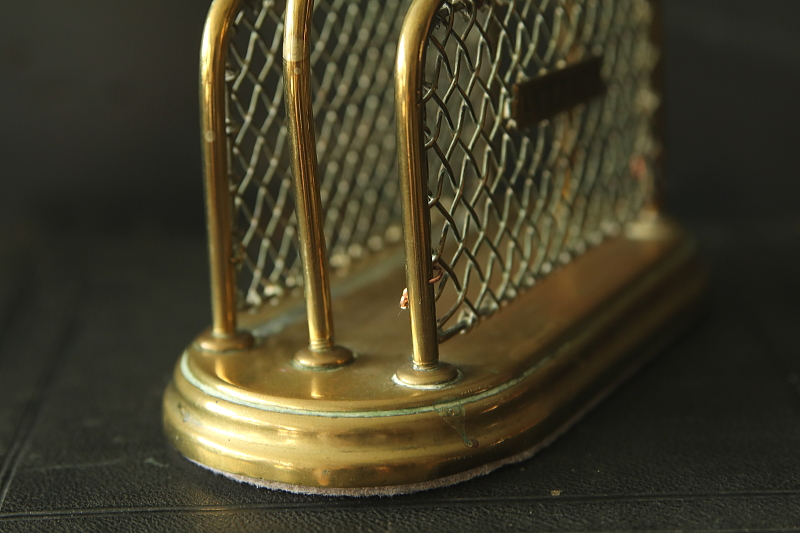 ★A&C15769 真鍮のレターラック W16.3,D7.7,H11.8cm / 送料:Aランク 【送料ページはこちら】 ◆ご注文方法はこちら◆ 真鍮のパイプ枠とワイヤーの網目の組み合わせに、真鍮の輝きがトロリと移ろう、英国好みのレターラック。「LETTERS」のプレートや、台座の作りもしっかりしており、絵葉書や写真、文庫本などを飾る、実用性のあるディスプレイとしてよさそうです。20世紀初期のイギリス製。 前面の枠のつなぎを銅のワイヤーで補修されています。底面にはフェルトを貼っています。全体にしっかりした状態です。 手のモチーフの真鍮クリップや、パピエマシェのライティングボックスをご紹介しています。下部のリンクからご覧ください。 |