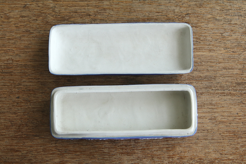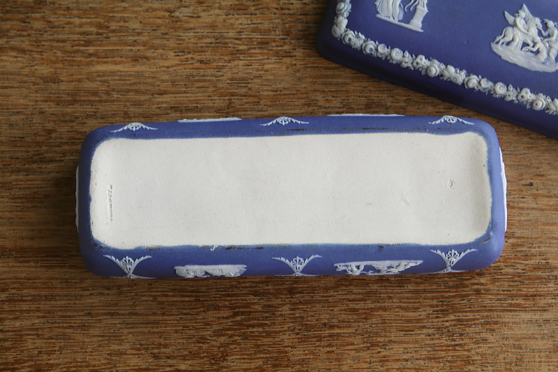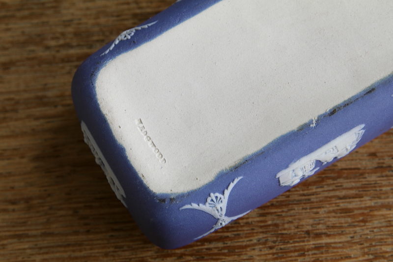 ★A&C15770 ジャスパーウェア トリンケットボックス "WEDGWOOD" W17.5,D6.3,H4.5cm / 送料:Aランク 【送料ページはこちら】 ◆ご注文方法はこちら◆ 深いブルーを背景に、緩やかな時間の中で暮らすいにしえの神々の姿を描いた、WEDGWOODのジャスパーウェア。ペガサスを駆る神々や有翼のチェラブたち、縁取る薔薇の花綱など、細密に描かれた生き生きとした神話の光景です。乾いた陶肌に浮かび上がらせる、白いレリーフが際立つアンティークジャスパーは、1900年頃のイギリス、ウエッジウッド製。 特に目立つダメージは見られない、きれいなしっかりした状態です。 ジャスパーウェアのアクセサリーや蓋物をご紹介しています。下部のリンクからご覧ください。 |