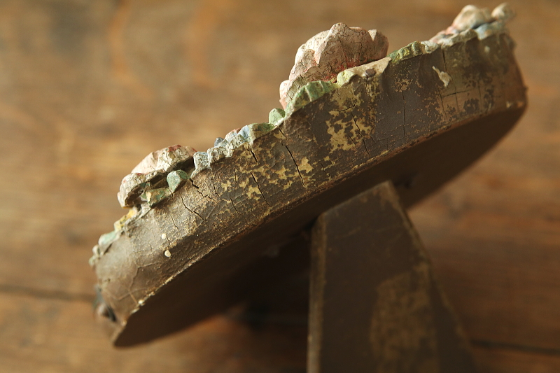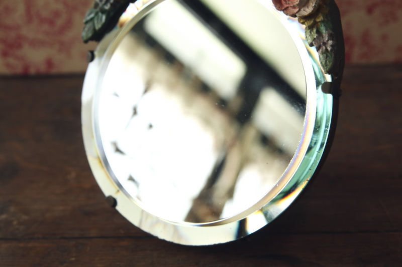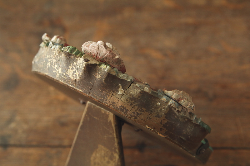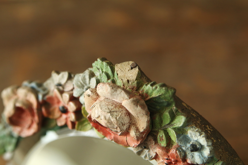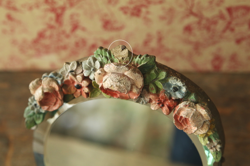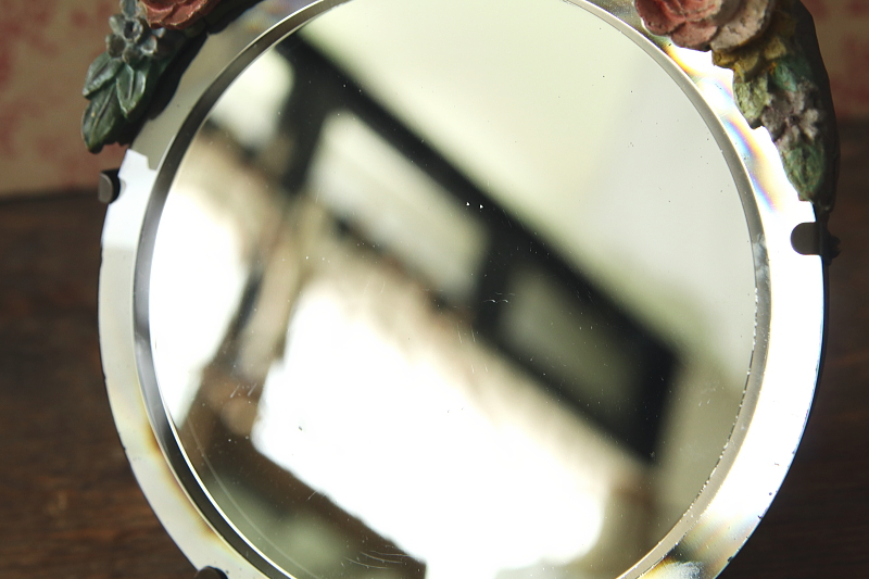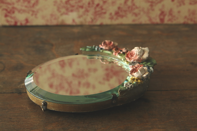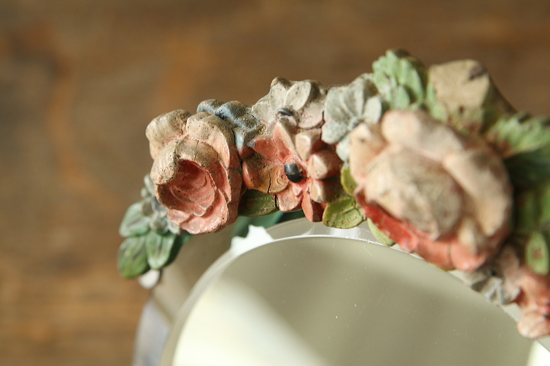 ★A&C15777 薔薇のバーボラミラー W15,D4,H18.5cm(脚含まず) / 送料:Aランク 【送料ページはこちら】 ◆ご注文方法はこちら◆ 小さな円いミラーは、厚みあるアンティークミラーならではの、映り込んだ鏡像にも深みを感じさせて、周りを薔薇や小花を象る、あたたかな色合いのバーボラが飾リます。古いバーボラなので、収縮によるヒビや、わずかに退色した、経年の落ち着いた風合いが魅力で、ミラーの写りもきれいな実用的なアンティーク。1930~40年代頃のイギリスから。 古いバーボラなので、欠けが1ヶ所見られますが、目立たず嫌な感じはしないと思います。鏡の表面にわずかにキズが幾らか見られますが、気になるものではなく、鏡の映りもきれいです。枠の爪が1ヶ所欠損していますが、しっかりしており使用上問題ありません。 色々なデザインのアンティークミラーをご紹介しています。下部のリンクからご覧ください。 |