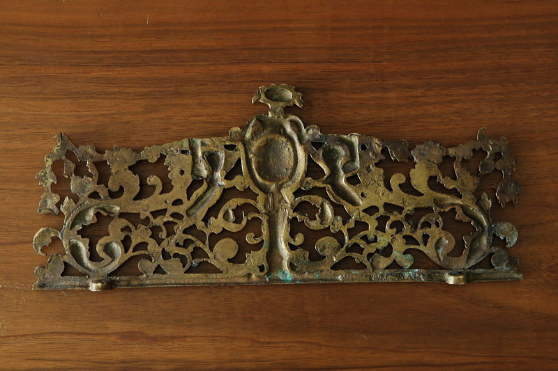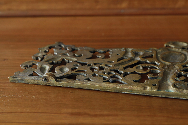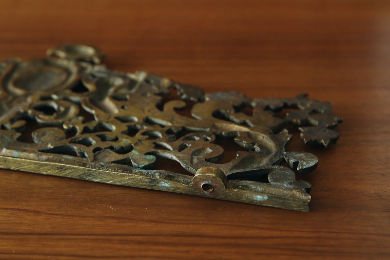 ★A&C15782 天使の真鍮家具飾り W29×H12xm / ¥31,000.-〔税込み〕 送料:宅配便送料無料(3万円以上) ◆ご注文方法はこちら◆ 天上の花唐草の中飛び交い、二人の天使がモノグラムエリアを掲げる、荘厳な輝きのオブジェ。古い真鍮が長い時間の中で、輝きにも深みをまとい、華麗なレリーフをくっきりと浮かび上がらせます。細やかなディテールを透かしで表現した、キャストブラスの贅沢な素材感を味わえる、1900年頃のフランスのちょっと特別な家具飾り。 数ヶ所に折れがありますが、全体の強度に影響はありません。それ以外は全体にきれいなしっかりした状態です。透かしを利用してフックなどに掛けて飾っても良さそう。重みがあるので立てかけて飾っても。 華やかな装飾のカーテンタイバックや家具飾りをご紹介しています。下部のリンクからご覧ください。 |