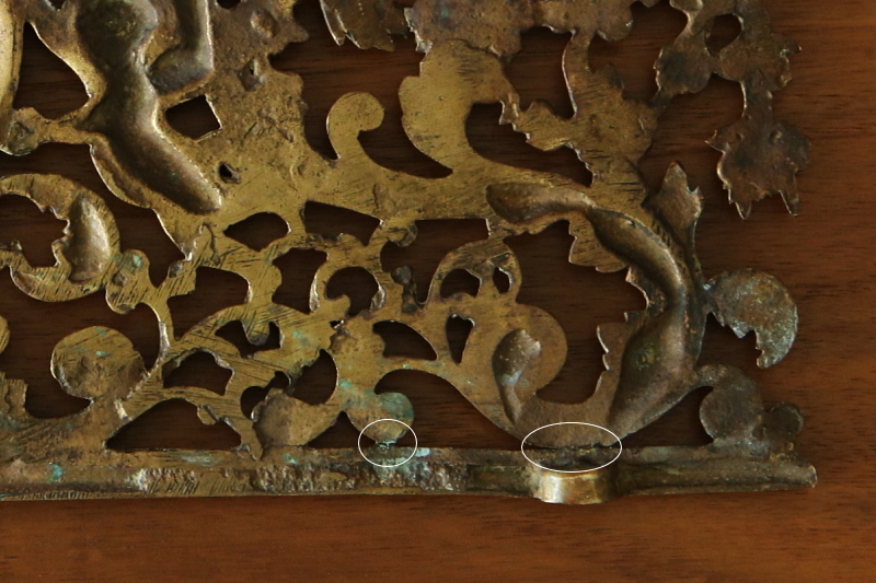 ![]() 下部に2ヶ所ネジ穴があります。下から留めるためのもので、貫通しておらず、上からは留められません。 |