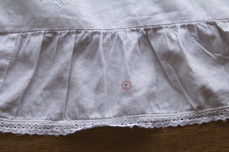 ★A&C15800 コットンラージクッションカバー 82×87cm / 送料:Aランク 【送料ページはこちら】 定形外郵便対応【ご注文時にお申し付けください】 ◆ご注文方法はこちら◆ 薄手のコットンにカットワークや刺繍で植物模様を描いて、可愛らしく飾り立てたクッションカバー。周囲をふんわりフリルが取り巻いて、かわいらしいムードに溢れた、ゆったりとしたサイズのひと品です。開口部がファスナー式で古いものではなさそうですが、軽い生地感に重ねたピンタックやレースなど、軽やかな愛らしさが魅力です。カットワークや刺繍はマシンだと思います。ファスナーはスライダーがなくなっており、スナップボタンで留められるように補修されています。フリルに1ヶ所小さな穴が開いていますが目立ちません。それ以外は全体にきれいなしっかりした状態です。インナークッションは付属しません。 (状態については、出来る限り注意深く確認しておりますが、見つけきれなかった小さな染み、薄い染み、僅かな糸切れ等、目立たない小さなダメージがあることもございます。何卒ご容赦ください。) |