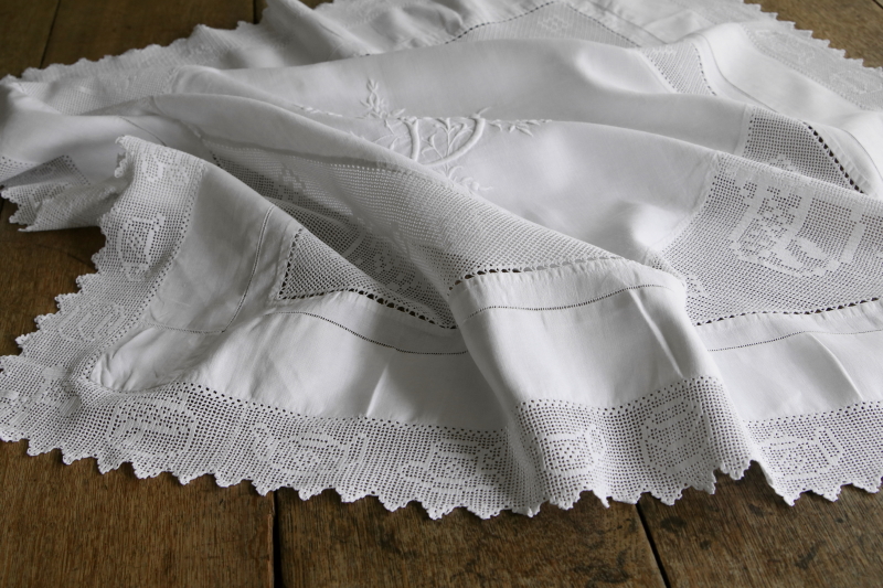 ★A&C15802 ティータイムパターン イニシャルエンブロイダリー リネンテーブルクロス W102×H102cm / 送料:宅配便送料無料(3万円以上) ◆ご注文方法はこちら◆ テーブルの四隅や縁から垂れるブレードのクロッシェレースに、ティーポットやティーカップ、シュガー&クリーム、シュガートングなど、紅茶道具のパターンが所狭しと描き上げられたイギリスらしい一枚。中央のリネンには、華麗な花文字の大きなイニシャルを、刺糸のボリューム感も充分な、特別豪華なリネンテーブルクロスです。お茶の時間にこれ以上無い絵柄と、テーブルに敷くだけでお部屋を明るくしてくれそうな、白いリネンやレースが鮮やかな一枚です。四隅のクロッシェから、テーブルの木色が顔を覗かせて、爽やかなリネンの白を一層鮮やかに引き立ててくれます。可愛らしさ、華やかさの中に精緻な技術を感じる手仕事に飾られて、お茶の時間がますます楽しみになりそうです。特に目立つダメージの見られない、きれいなしっかりした状態も嬉しいです。イギリスから。 (状態については、出来る限り注意深く確認しておりますが、見つけきれなかった小さな染み、薄い染み、僅かな糸切れ等、目立たない小さなダメージがあることもございます。何卒ご容赦ください。) |