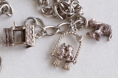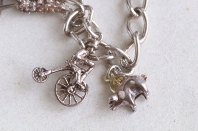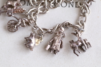 ★A&C15836 12チャーム&パドロックブレスレット L18cm(29.3g) / sold 925シルバー 送料:Aランク 【送料ページはこちら】 ◆ご注文方法はこちら◆ シルバーチェーンにジャラジャラ提げる、12個の小さな銀のチャーム達。一つ一つ摘み上げて、造形の面白さや可愛らしさに感心させられる。動物が多いけれど目を引くのはやはりパディントンベア。帽子とダッフルコート姿にトランクを下げたおなじみの姿がすごく可愛い。他にもメガネのフクロウやリス、ハリネズミ、麦穂をかじるマウスや鹿の親子、バレリーナに豚の貯金箱などなど…、セレクトにもセンスが感じられる、こだわりが詰まったキュートなイギリスのヴィンテージ。スターリングシルバーチェーンのしっかりとした重みも心地よい、ホールマークからパドロッククラスプは1986年のロンドン製と分かります。 特に目立つダメージの見られない、きれいなしっかりした状態です。写真のケースは付属しません。 有償で約7ミリ単位でサイズダウン加工が可能ですので、お気軽にご相談ください。 様々なデザインのアンティーク、ヴィンテージブレスレットをご紹介しています。ページ下部のリンクからご覧ください。 |