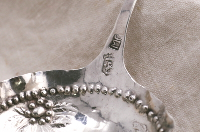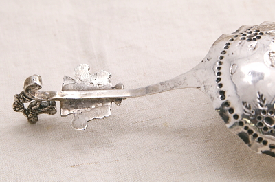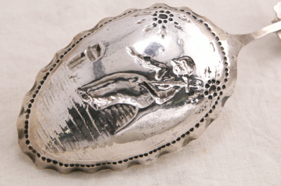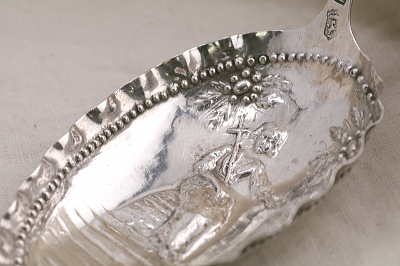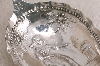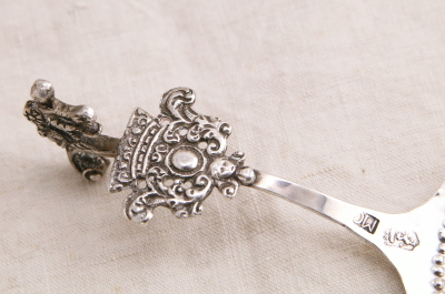 ★A&C15847 幼子ヨハネのシルバースクープ HANAU L15.5cm(27g) / ¥22,000.-〔税込み・送料別〕 シルバー 送料:Aランク 【送料ページはこちら】 ◆ご注文方法はこちら◆ 薄い銀板を叩き出して造形した装飾的なシルバースプーンのボウルに浮かぶ姿は、携えた十字の杖から幼子の洗礼者ヨハネでしょう。大ぶりなボウルに短く飾りの付いたハンドル。クラシカルでユーモラスなモチーフたちはどこか幻想的でもあります。19世紀のドイツのハーナウのメーカーに特徴的な、より古い時代のアンティークの様式を折衷した銀細工のユニークなスタイルです。大ぶりなボウルはサービング用のスクープとして、個性的な謎のモチーフも、食卓の話題に盛り上がりそうな、19世紀ドイツの銀のスプーンです。 特に目立つダメージの見られない、きれいなしっかりした状態です。 レリジャスなモチーフのスプーンやグラスをご紹介しています。ページ下部のリンクからご覧ください。 |