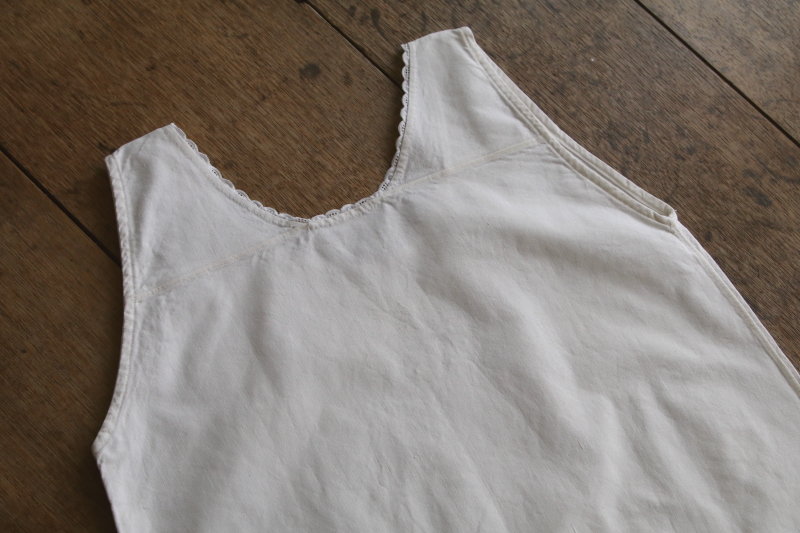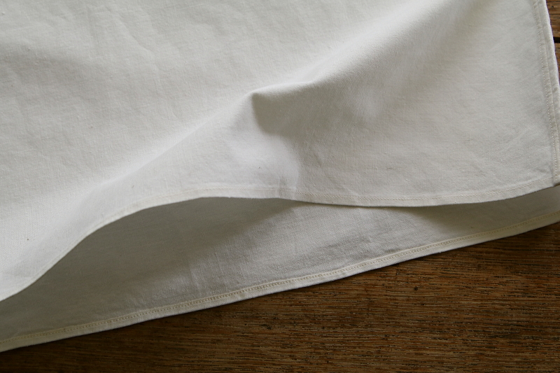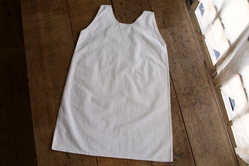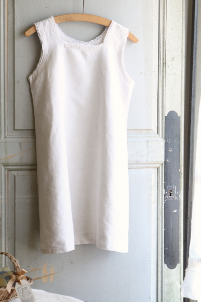 ★A&C15855 イニシャル刺繍のリネンナイティ 全長:86cm 着丈:74cm 肩幅:34cm 胸幅:46cm 裾幅:58cm / ¥9,300.-〔税込み・送料別〕 送料:Aランク 【送料ページはこちら】 ◆ご注文方法はこちら◆ シンプルなシルエットのノースリーブリネンナイティ。しっかりとした中厚の張りのある生地で、生成りの爽やかな肌触りが好ましい一着。胸元に形よく刺されたイニシャル刺繍や、襟ぐりのレースも可愛らしく、素朴さと洒落感を愉しんでいただけそう。フランスから。 折りじわに沿って薄い日焼け染みが見られますが、よく見ないとわからない程度で目立ちませんす。それ以外は全体にきれいなしっかりした状態です。 (状態については、出来る限り注意深く確認しておりますが、見つけきれなかった小さな染み、薄い染み、僅かな糸切れ等、目立たない小さなダメージがあることもございます。何卒ご容赦ください。) 他にもナイティやキャミソールをご紹介しています。ページ下部のリンクからご覧ください。 |