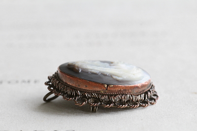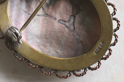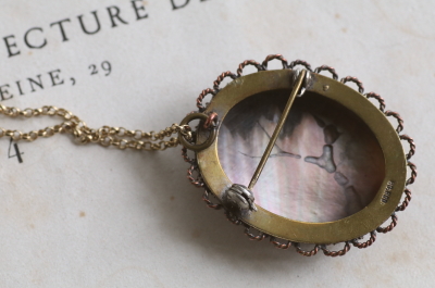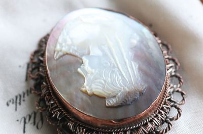 ★A&C15860 マザーオブパールカメオ ペンダントブローチ 30.5×37mm(9.2g) / ¥21,800.-〔税込み・送料別〕 マザーオブパール / 800シルバー(ロールゴールド) 送料:Aランク 【送料ページはこちら】 ◆ご注文方法はこちら◆ マザーオブパールに彫り上げた、白く輝く貴婦人の横顔が、背景の虹色に浮かび上がるペンダントブローチ。縦ロールの豊かな髪と優しげな表情の横顔が、光の角度で表情を変える、自然の恵みの輝きが魅力的なひと品です。ブローチとしても、丸カンにチェーンを通して、ネックレスとしても愉しめるので、ちょっと得した気分です。20世紀中期のイタリア製。 ロールゴールドから、シルバーの露出が幾らか見られます。特に目立つダメージの見られない、きれいなしっかりした状態です。チェーンは付属せず、ペンダントブローチのみの販売です。写真のケースは付属しません。 ラーバカメオやジャスパーカメオのアクセサリーをご紹介しています。ページ下部のリンクからご覧ください。 |