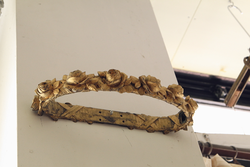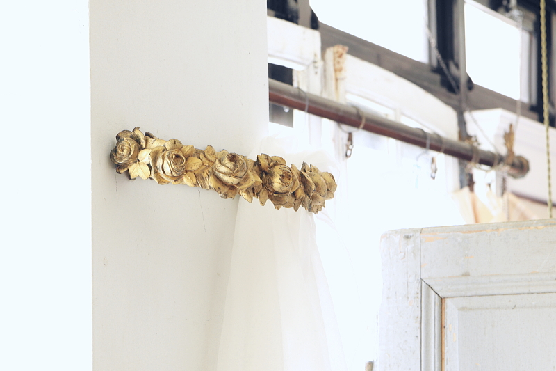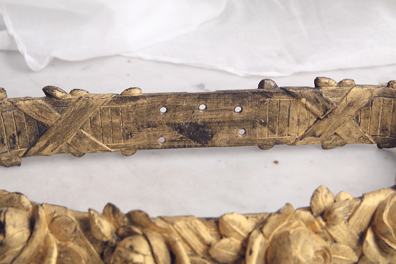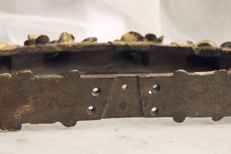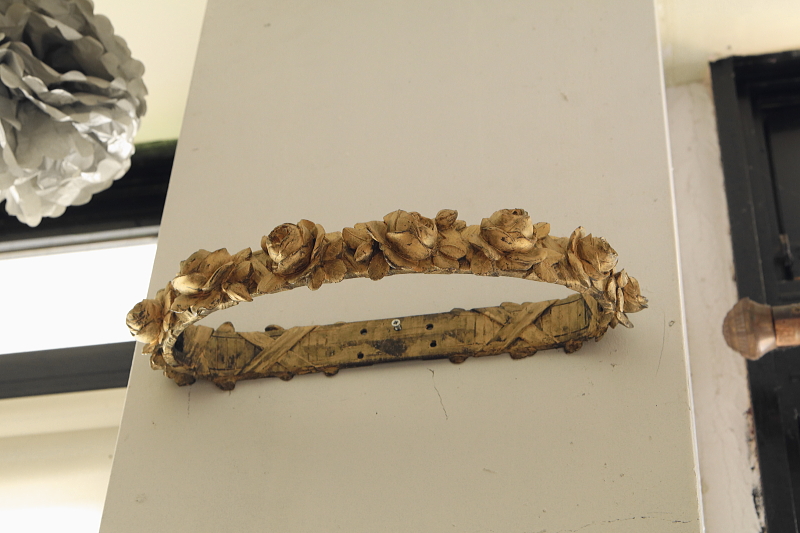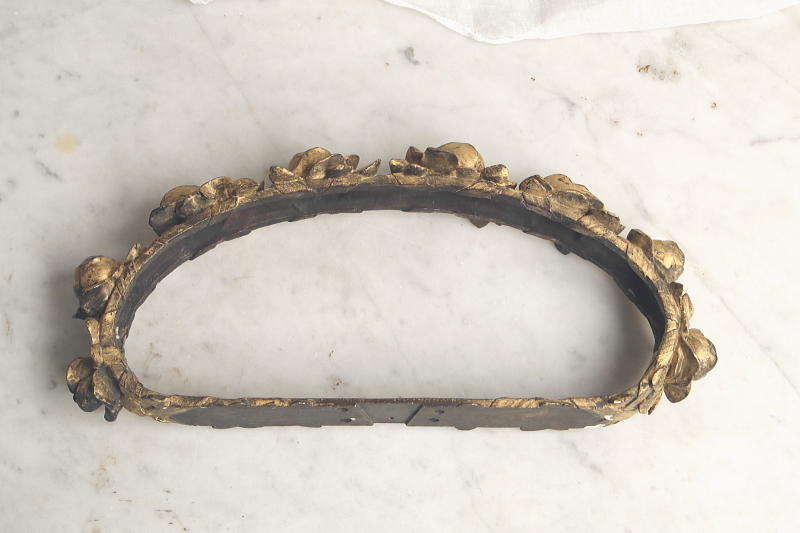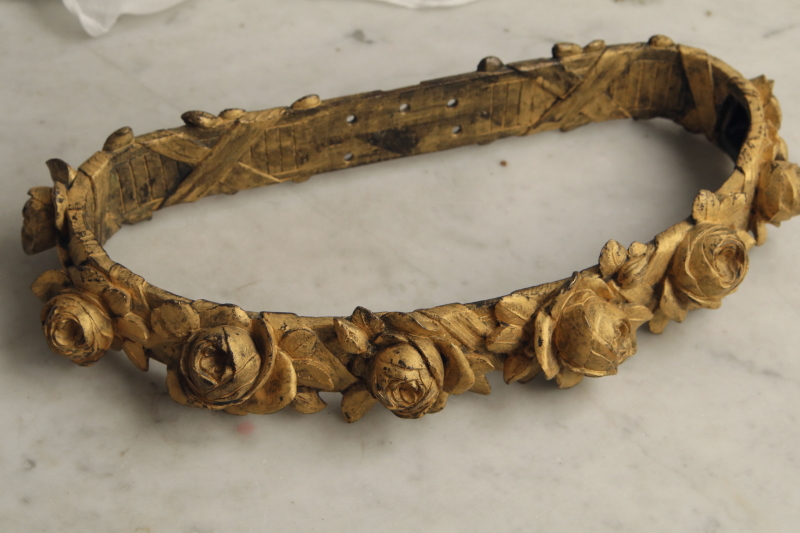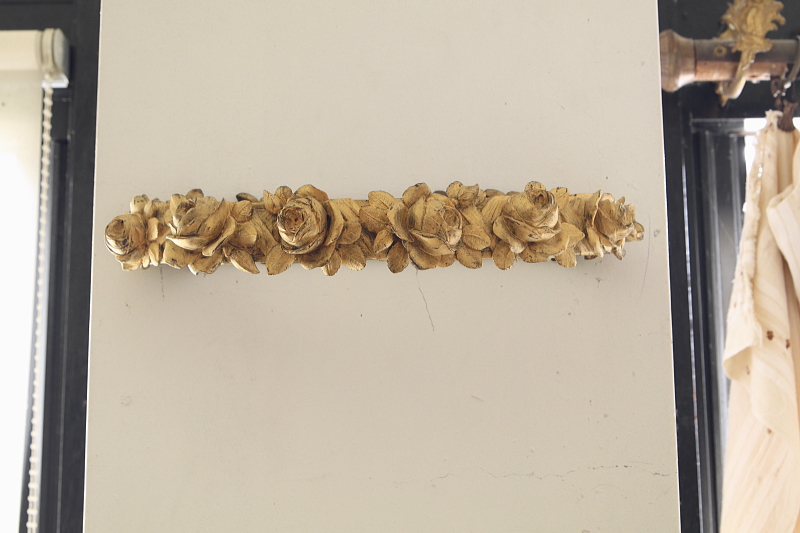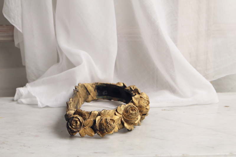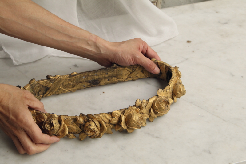 ★A&C15870 ブロンズの薔薇の天蓋装飾 W36,D16,H5.5cm(2.7kg) / 送料:宅配便送料無料【3万円以上】 ◆ご注文方法はこちら◆ 大輪の薔薇が美しさを競うように一列に繋がり宙に浮かぶ黄金のリング。重厚なブロンズの輝きで表現された、小さいけれどグラマラスな作品です。ベッドの上部にレースや織地を吊るす中心となった、天蓋装飾です。金色の輝きと影が作り上げる、あでやかな薔薇の花姿に魅了される、優雅な装飾品は、百年以上昔のフランスの品。美しいだけでなく力強さを感じる、目を離せない存在感です。 金色の塗装のスレが所々見られますが、それらもアンティークの魅力的な風合いです。折れや欠け、ひびは見られず、しっかりしたきれいな状態です。 重量があるので、取り付けには十分ご注意ください。 ブロンズのカーテンタイバックなどをご紹介しています。ページ下部のリンクからご覧ください。 |