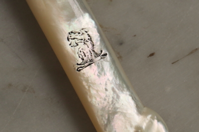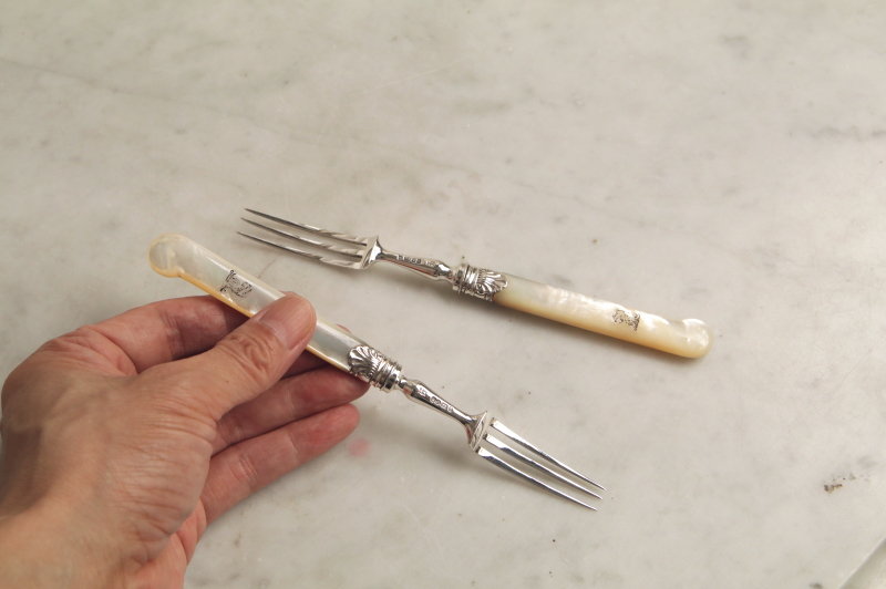 ★A&C15871 スターリングシルバーデザートフォーク 龍紋のマザーオブパールハンドル A&C15871-A: L17.1cm(33.7g) / sold A&C15871-B: L17.2cm(35.7g) / ¥15,000.-〔税込み・送料別〕(ハンドルにヒビ) 送料:Aランク 【送料ページはこちら】 ◆ご注文方法はこちら◆ スターリングシルバーのフォークに、アカンサスの装飾が鮮やに輝きます。マザーオブパールのハンドルには、龍らしき紋が描かれる、華麗な装飾が魅力的なデザートフォーク。スタイリッシュでエレガントなシルエットにシルバーの持ち重り、手指に感じる自然素材の滑らかな手触りが贅沢なアンティークデザートフォーク。ヴィクトリア女王のシルエットが添えられた、ホールマークも装飾に思える1888年のイギリス、シェフィールド製です。 Bのハンドルの付け根にヒビが見られますが、強度的な問題はなくあまり気にならないと思います。それ以外はシルバー表面に小キズが見られる程度で、全体にしっかりした きれいな状態です。フォークとハンドルをニカワで接着していると思われます。湯水に長時間浸けたり煮沸すると、ニカワが溶けますので注意して下さい。食洗機不可。 マザーオブパールハンドルのデザートナイフ&フォークをご紹介しています。ページ下部のリンクからご覧ください。 |