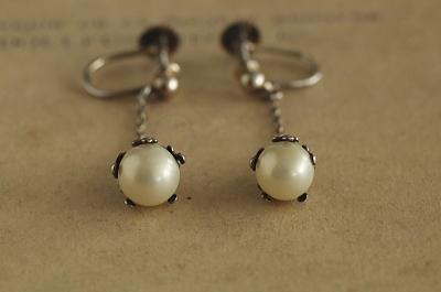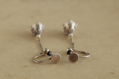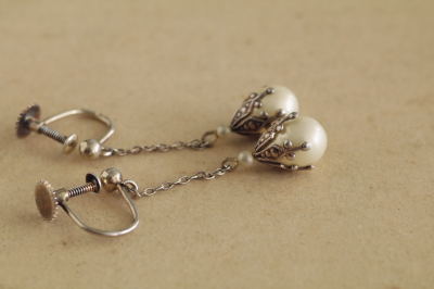 ★A&C15874 グラスパールドロップ シルバーイヤリング W6.8~7.2,H33.5~35mm(片方1.4g) / sold ガラス / 830シルバー 送料:Aランク 【送料ページはこちら】 定形外郵便対応【ご注文時にお申し付けください】 ◆ご注文方法はこちら◆ チェーンの先に揺れる、グラスパールの雫型の光沢が愛らしいイヤリング。透明感のある白と、シルバーの輝きが清楚なデザインから、落ち着いた華やかさが滲み出します。ごく小さな20世紀前期のヨーロッパの品。 様々な素材、デザインのアンティークジュエリーをご紹介しています。ページ下部のリンクからご覧ください。 |