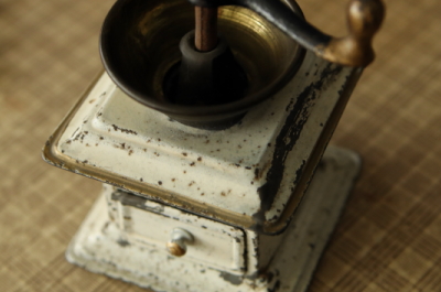 ★A&C15876 ブリキのスパイスミル W7.5,D6.4,H9.4cm / 送料:Aランク 【送料ページはこちら】 ◆ご注文方法はこちら◆ オフホワイトにペイントされた、ブリキの箱型スパイスミル。ミニチュアのコーヒーミルかとも思いましたが、しっかりした鋳物のミルや、ペイントの下からいくらか錆を浮かび上がる、長い間使い込まれた道具の味わいを纏う、堂々とした姿です。コーヒーミルに比べると随分数が少ないアイテムで、手元に置いておきたくなる小さく可愛らしい姿です。構造上分解できないので、実用よりはインテリアとして楽しみたい。20世紀初め頃のフランスから。 ブリキのキッチンツールやミニチュアツールをご紹介しています。ページ下部のリンクからご覧ください。 |