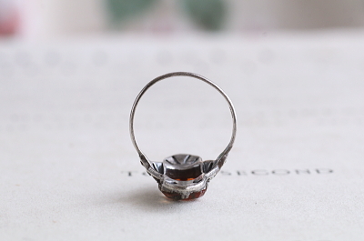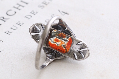 ★A&C15885 モスアゲート シルバーアールデコリング サイズ:15.5号(2.9g) / sold 天然アゲート / 935シルバー 送料:Aランク 【送料ページはこちら】 ◆ご注文方法はこちら◆ 瑪瑙(アゲート)の透明感のある赤みに、黒緑の内包物が現れる渋い表情が魅力的。周りを飾るアールデコならではの幾何学的なデザインが、シルバーとマーカサイトの輝きで、モスアゲートの天然の模様を引き立てます。ボリューム感とシックな落ち着きの両方を愉しめる、20世紀前期のヨーロッパ製。 特に目立つダメージの見られない、きれいなしっかりした状態です。こちらのリングは、サイズ加工は承れません。写真のアンティークケースは付属しません。 他にもアゲートのジュエリーをご紹介しています。ページ下部のリンクからご覧ください。 |