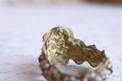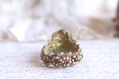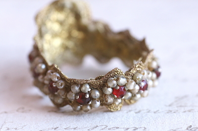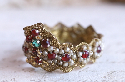 ![]() 赤とグリーンのラインストーンはプラスティック製。白いビーズはガラス製。 |