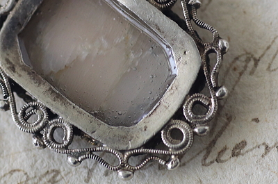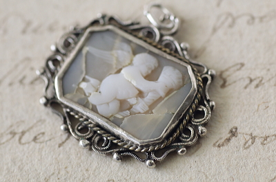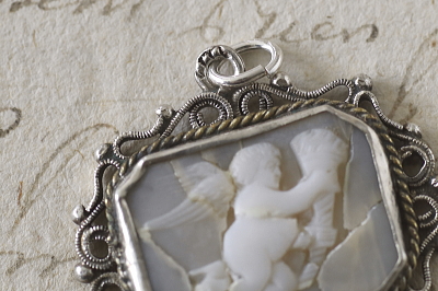 ★A&C15888 天使のカメオペンダント シルバーフィリグリーフレーム W25,H23mm(マルカン含まず)(2.7g) / sold 天然シェル / シルバー 送料:Aランク 【送料ページはこちら】 ◆ご注文方法はこちら◆ 銀線の編んだようなフレームに収まる半透明の白い貝に浮かぶのは、大きな松明を掲げ闇を照らす小さな天使の姿。貝に表れた無数のひびが、ステンドグラスのように見えて、神々しさを感じる小さなペンダントです。 16×12ミリのごく小さなキャンバスに繊細な表現で彫刻された古典的な神話モチーフは19世紀の品と考えられ、おそらく乾燥によるものでしょう、無数のひびが貝に入っていましたが、一片も失われることなく銀枠の中に留まっていたので、クリーニング後、背面を樹脂で固着補強して再生しました。百年の歳月のなかで傷ついた、ちっぽけな存在を、愛おしく、尊く感じてしまう、アンティークの世界を広げてくれるひと品だと思います。19世紀のイタリアから。 チェーンは付属せず、ペンダントトップのみの販売です。背面を厚い樹脂で固着補強していますので、強度的な心配はないと思いますが、表面の段差による引っ掛かりなど、取り扱いにはご注意ください。 天使のカメオブローチをご紹介しています。ページ下部のリンクからご覧ください。 |