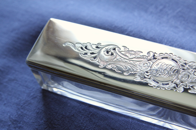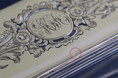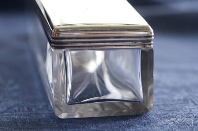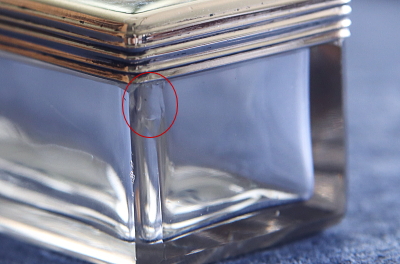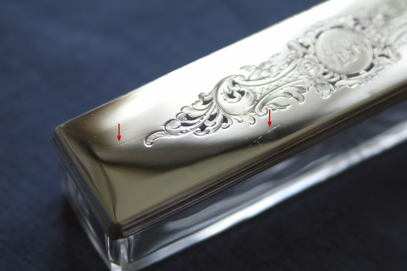 ★A&C15894 銀蓋のハットピンボックス・アーリーヴィクトリアン W17.8,D3.8,H3.7cm(蓋51.8g) / ¥58,000.-〔税込み〕 送料:宅配便送料無料【3万円以上】 ◆ご注文方法はこちら◆ スターリングシルバーに、ハンドエングレービングで繊細華麗な模様とモノグラムが描かれて、輝きも一層鮮やか。厚みと重みを持たせたカットガラスの器にふさわしい、50gを超える銀を使ったしっかりした蓋には細かな手仕事の彫刻と、ピアシングによる透かしが施された、手の込んだひと品。時代が時代ですから、真のレディーのドレッシングテーブルのために誂えられたハットピンボックスです。ジュエリーケースや小物入れとして魅力的な存在感のケースです。ホールマークから1846年のロンドン製と分かる、ヴィクトリア朝初期の贅沢なアンティークです。 蓋は厚い銀板で、歪むことなくしっかり閉まります。細かな傷はいくらか見られますが、しっかり磨き込んでいます。ガラスボックスの角に1箇所、薄い欠けを均した跡があります。他に小さなキズが数か所、カットのエッジに引っ掛かり程度の小さな欠けが写真以外にも少々見られますが、あまり目立たず強度的な問題はありません。 ガラスのハットピンケースや、アクセサリースタンドをご紹介しています。ページ下部のリンクからご覧ください。 |