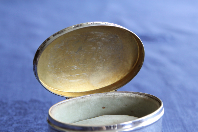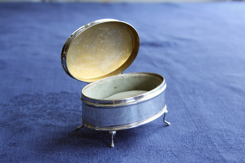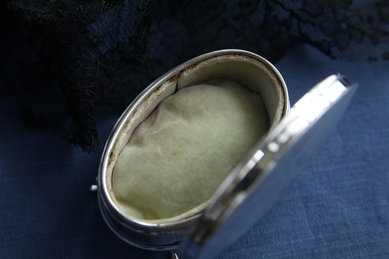 ★A&C15897 スターリングシルバー オーバルジュエリーケース W7.8,D5,H4.5cm(64.7g) / ¥43,000.-〔税込み〕 送料:宅配便送料無料【3万円以上】 ◆ご注文方法はこちら◆ 滑らかなカーブを描くオーバルシルエットに、精緻な筋彫りとイニシャルがハンドエングレービングで描かれ、スターリングシルバーの輝きもますます鮮やかに浮かび上がらせます。4本の小さな脚が支える整ったシルエットに、銀の輝きがまばゆいひと品は、1924年のイギリスはバーミンガム製。100年の時間を過ごしてなお、内部の淡いグリーングレーのベルベットクッションも比較的きれいな状態で、底のレザー張りなど見えないところもしっかり作られた美しい小品です。 側面に小さな凹みが少々見られます。周囲に微かな線状の凹みもありますが、こちらはほとんど目立ちません。全体にしっかりした状態です。 様ざなまデザイン、素材のジュエリーボックスをご紹介しています。ページ下部のリンクからご覧ください。 |