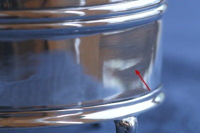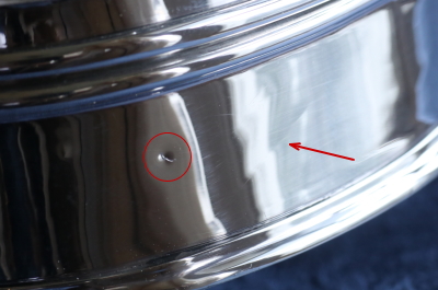 ![]() 前面左側。丸の位置に小さな凹みと、矢印の位置に微かな線状の凹み。 |