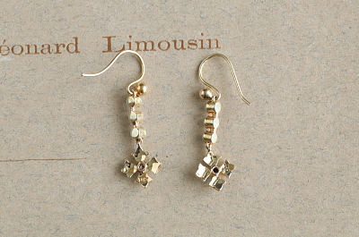 ★A&C15900 シードパール&オールドヨーロピアンカットダイヤ ゴールドドロップピアス 8.5×27mm(片方0.7g) / ¥159,000.-〔税込み〕 天然ダイヤモンド / 本真珠 / K15ゴールド / K9ゴールドフック 〔品質保証書付き〕 送料:宅配便送料無料【3万円以上) ◆ご注文方法はこちら◆ 2ミリほどの小さな真珠を繋げて、柔らかな光沢が揺れる、この上なくフェミニンな仕上がりのドロップピアス。先に開いた小さな花の真中に、小さく煌くオールドカットのダイヤモンドがアクセントです。 1900年頃の品で、小さなシードパールを使った繊細で女性らしい細工は、この時代ならでは。後にも先にも、これほどまでの素材感とディティールを再現するのは難しい貴重な存在で、ピアスやイヤリングとなれば尚更希少なアイテムと言えます。ダイヤと真珠とゴールド。オーセンティックで普遍的な組み合わせだからこそ、デザインとディティールの美しさが活きる、さりげなくラグジュアリーを漂わせるアンティークピアスです。1900年頃の英国製。 気になるダメージのない、きれいなしっかりした状態です。写真のジュエリーケースは付属しません。 パールとダイヤモンドの輝きが美しい、アンティークジュエリーをご紹介しています。ページ下部のリンクからご覧ください。 |
