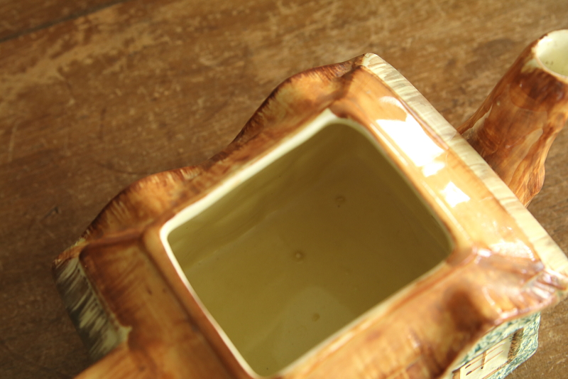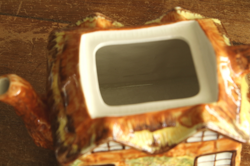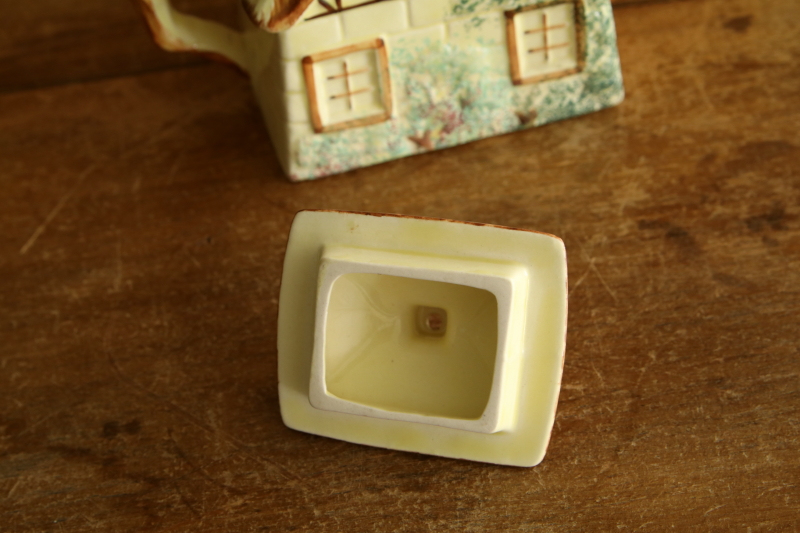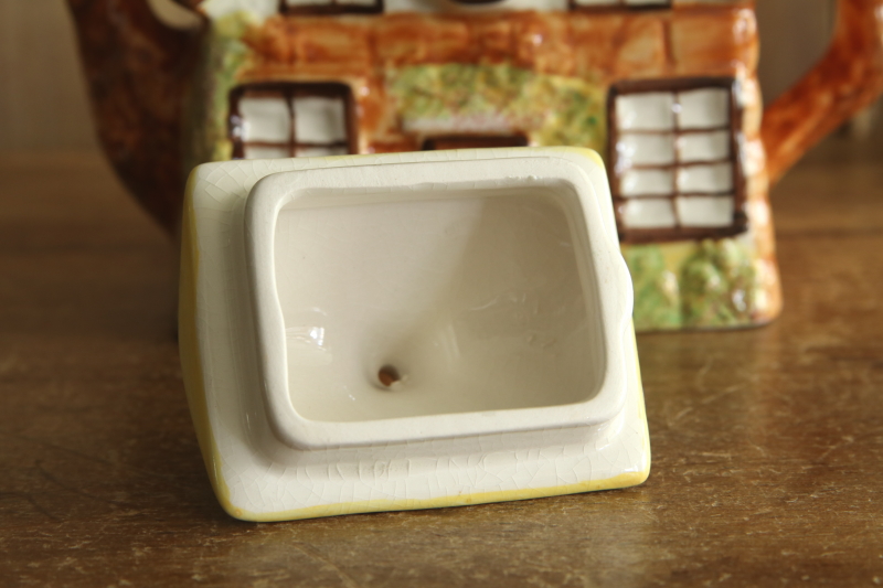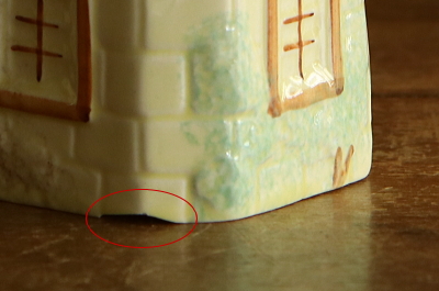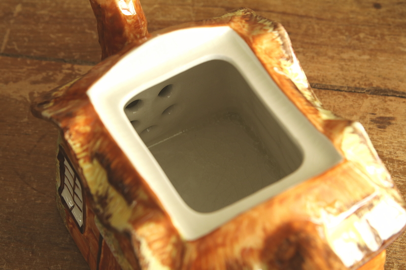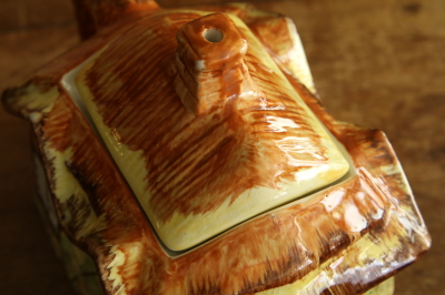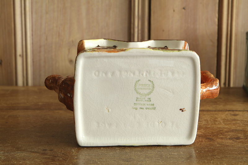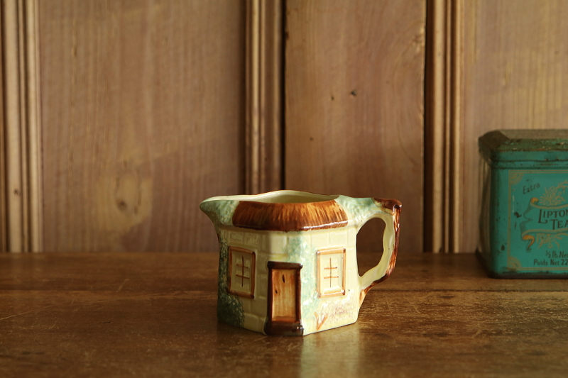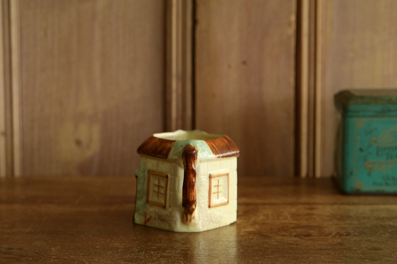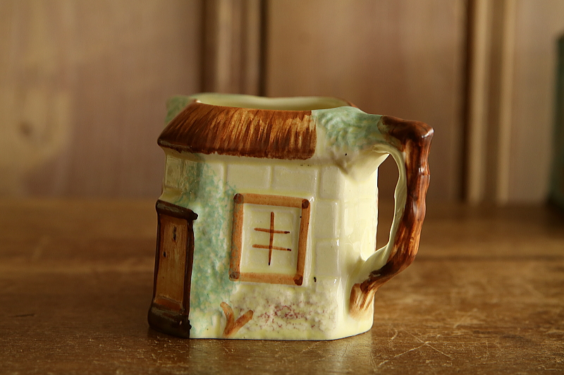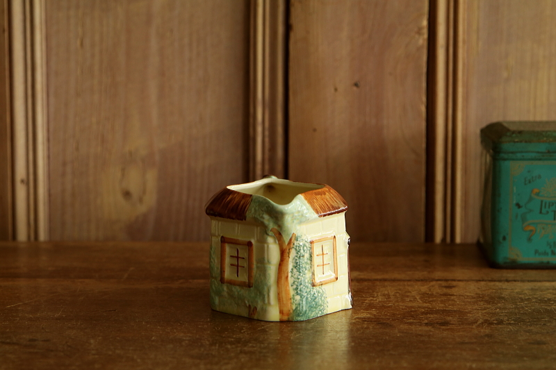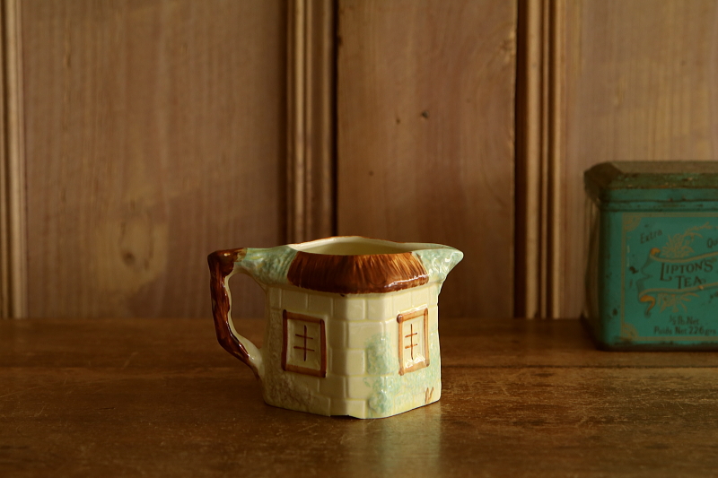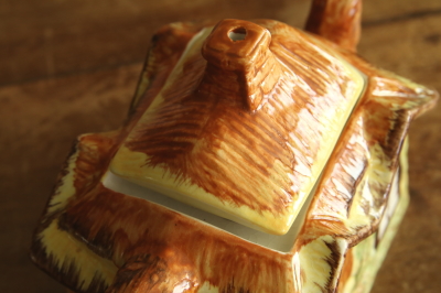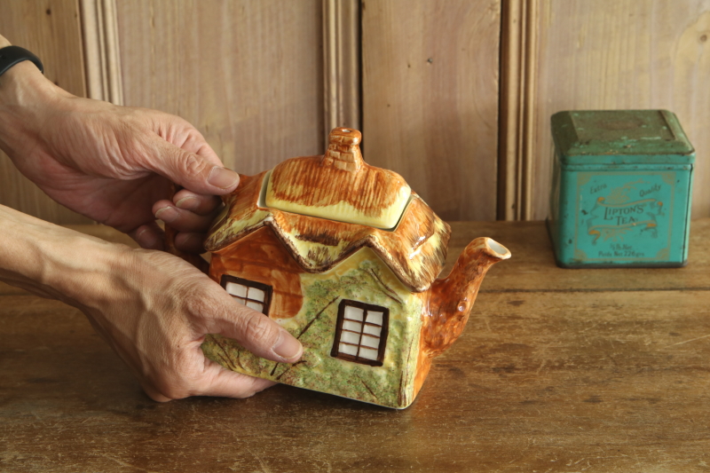 ★A&C15902 カントリーコテージティーポット A&C15902-A:(ティーポット&クリームジャグ) ティーポット:W21,D11,H13cm クリームジャグ:W11.8,D8.5,H7.4cm / A&C15902-B:(ティーポット) 21,D11.3,H14.5cm / ¥13,600.-〔税込み・送料別〕 送料:Aランク 【送料ページはこちら】 ◆ご注文方法はこちら◆ 田舎の可愛らしいコテージが、可愛らしい陶器のティーポットになりました。ハンドペイントで藁葺き屋根など描き、ハンドルや注ぎ口の庭木や、蓋のつまみの煙突など愛らしいことこの上ない。窓の脇にも庭木のレリーフを描いて、緑と共生する暮らしを想起する温かな表情の陶器です。 当時はやったものなのでしょう、Aのティーポット&クリームジャグはPARAMOUNT POTTERY製。BのティーポットはPRICE & KENSINGTON製と、窯の違いによる色や表情の違いも面白い。何れも未使用品で、20世紀中頃のイギリス製。 Aのクリームジャグの底に薄い欠けがあります。Bの釉薬全体に貫入が見られます。 陶器や琺瑯のティーポットをご紹介しています。ページ下部のリンクからご覧ください。 |