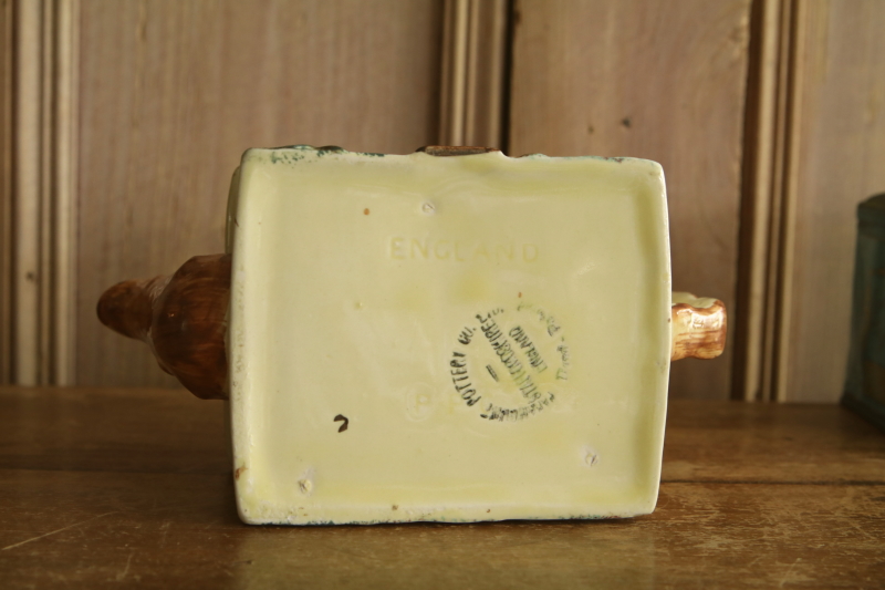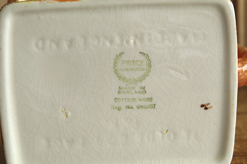 ![]() A&C15902-B:(ティーポット) 21,D11.3,H14.5cm / ¥13,600.-〔税込み・送料別〕 PRICE &KENSINGTON製。1945年のレジスタードナンバーがプリントされています。 容量は800ml程。スパウトの水切れは注ぎ口に一滴残る程度で、陶器のティーポットとしては標準的です。 蓋の収まりが、ほんの少しタイトで不安定ですが、気になるほどでもないと思います。 |