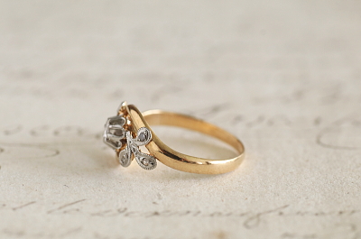 ★A&C15910 ローズカットダイヤ リーフ飾りリング サイズ11号(2.1g) / sold 天然ダイヤモンド / K18ゴールド / プラチナ 〔品質保証書付き〕 送料:宅配便送料無料〔3万円以上〕 ◆ご注文方法はこちら◆ 透明感のあるダイヤモンドの明るい瞬きにも懐かしく優しい表情が滲むのは、ローズカットダイヤモンドならでは。両脇にはそれぞれ3石ずつ小粒のプリミティブなカットのダイヤをセットした、リーフの飾りが添えられて可愛らしい。イエローゴールドのシャンクがダイヤの上下で交差して、K18ゴールドのリッチな色みと、プラチナとの鮮やかなコントラストは、100年昔のアンティークでありながら、軽快でポップな印象も受ける、この時代のフランスらしいファッショナブルな仕様とデザイン。ローズカットダイヤモンドをしっかりと支える8本の爪や、リーフの縁のミル打ちなど、華奢なのにしっかりした丁寧な作り込みにもラグジュアリーが漂います。20世紀初期のフランス製。 特に目立つダメージの見られないきれいなしっかりした状態です。サイズ直しは有償にて承ります。お気軽にご相談ください。写真のアンティークケースは付属しません。 他にもダイヤモンドリングなど、アンティークジュエリーをご紹介しています。ページ下部のリンクからご覧ください。 |