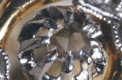 ![]() ローズカットダイヤの直径は2.2ミリ。リーフを含むフェイスのサイズは14×9ミリ。(※ラウンドブリリアントカットのダイヤのサイズによる目安は、直径2.0ミリで0.033カラットとされています。) |