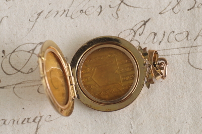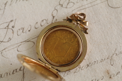 ★A&C15911 ゴールドトーンメタル ロケットチャーム 27×35mm(丸カン含まず)(7.0g) / ¥26,800.-〔税込み・送料別〕 合金 送料:Aランク 【送料ページはこちら】 ◆ご注文方法はこちら◆ 天辺に飾られるリボンが目を惹くルイ16世スタイルのロケットチャーム。緻密に刻まれたエングレービングや、真中の盾形のモノグラムエリアが誇らしげで、金色に輝く様子もますます華やかに思えます。蓋を開けると両側にセルロイドのカバーがリングで抑えられて、中に忍ばせる思い出を大切に守ってくれそうです。1900年頃のヨーロッパから。 チェーンは付属せず、チャームのみの販売です。 表面に僅かに小キズが見られますが、それ以外に特には目立つダメージの見られない、きれいなしっかりした状態です。チェーンは付属せず、ペンダントトップのみの販売です。写真のアンティークケースは付属しません。 他にも様々な素材、デザインのロケットチャームをご紹介しています。ページ下部のリンクからご覧ください。 |