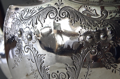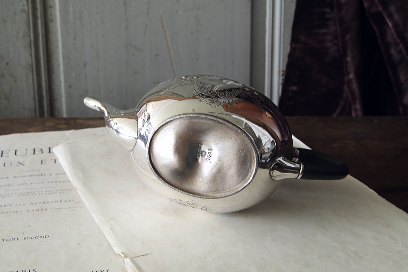★A&C15914 ハンドエングレーヴド ティーポット VIctorian W28,D12.5,H15.5cm / ¥34,500.-〔税込み〕 送料:宅配便送料無料〔3万円以上〕 ◆ご注文方法はこちら◆ シルバープレートの銀光輝くティーポットの、胴や蓋はもちろん、スパウトの根本にまで精密な、ハンドエングレーヴィングによる模様が施されています。胴のモノグラムエリアの両サイド、花模様の真ん中は、チェイシングで膨らみが表現されて、模様の作り出す陰影がますます華やかな手仕事が贅沢です。ブリタニアメタルベースにシルバープレートが施された、ヴィクトリアンの華やかな時代象徴するスタイルのティーポット。120年以上も昔の品ながら、ごく小さなキズが若干見られる程度で凹みも特に見られず、内部も比較的きれいな状態なのが嬉しい。19世紀のイギリス、シェフィールドの工房、Fenton Brothersによる美しいひと品です。 内部はクリーニング済みで、容量は1200ccほど。水切れ良いです。シルバープレート表面にキズがいくらか見られますが目立たず、他に凹みなどの目立つダメージは見られません。 他にもシルバープレートのティポット、ティーセットをご紹介しています。ページ下部のリンクからご覧ください。 |