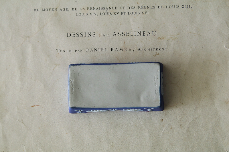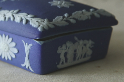 ★A&C15915 ジャスパーウェアのマッチボックス WEDGWOOD W9.5,D5,H3.2cm / 送料:Aランク 【送料ページはこちら】 ◆ご注文方法はこちら◆ ネイビーの深みに、白いレリーフが冴え冴えと浮かび上がる、イギリスの名窯ウエッジウッドのジャスパーウェアのマッチボックス。細やかに表現された古代の神々のレリーフは、古みのあるネイビーの陶肌に、アンティークジャスパーならではの透明感が美しい。硬く焼き締められたストーンウェアの小箱は、アクセサリーなど小物入れに使いやすく、実用的に愉しめるアンティークジャスパーです。1910年代ごろのイギリス製。 器形の歪みによる僅かなガタツキ、蓋の浮きがみられます。蓋の角にごく小さな欠け、窯キズが僅かに見られますが、目立たず特には気にならないと思います。 他にもウェッジウッドのジャスパーウェアをご紹介しています。ページ下部のリンクからご覧ください。 |
