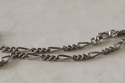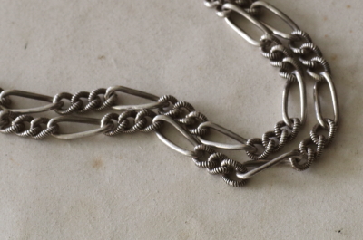 ★A&C15917 シルバーウオッチチェーンネックレス・Tバー L55.5cm(24.5g) / 800シルバー / シルバー 送料:宅配便送料無料〔3万円以上〕 ◆ご注文方法はこちら◆ イギリスのアルバティーナチェーンと、フランスのモチーフを連ねたウォッチチェーンを組み合わせて、デコラティブなネックレスに仕立てました。Tバーがペンダントのように揺れる、ロープのようなチェーンのアルバティーナと、特徴的なモチーフを連ねたシルバーチェーンとの相性も良く、完成されたデザインのネックレスとして愉しめます。何れのチェーンも19世紀のアンティークですから、デコラティブだけれどクラシカルで上品に仕上がりました。ロケットやお気に入りのチャームを加えて、自分なりにアレンジするのも楽しそうです。 19世紀のイギリス、フランス製。特に目立つダメージの見られない、きれいなしっかりした状態です。 同様のシルバーウォッチチェーンのネックレスをご紹介しています。ページ下部のリンクからご覧ください。 |