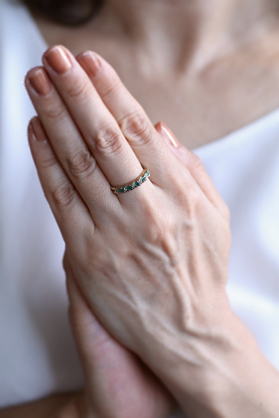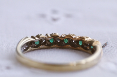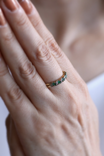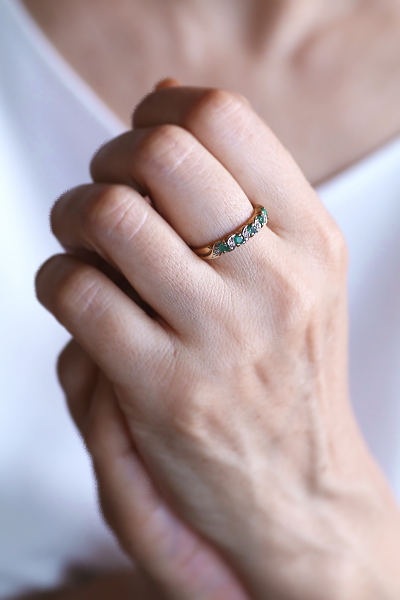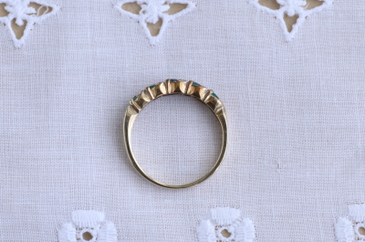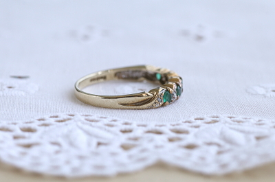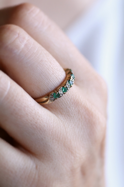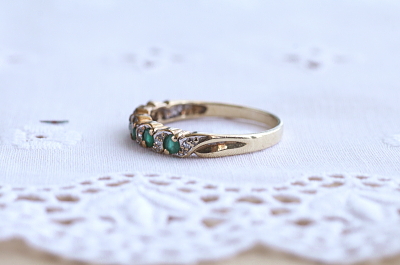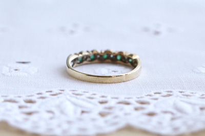 ★A&C15919 エメラルド&ダイヤ バンドリング サイズ14.5号(2.0g) / sold 天然エメラルド / 天然ダイヤモンド / K9ゴールド 送料:宅配便送料無料〔3万円以上〕 ◆ご注文方法はこちら◆ 細身のゴールドリングにエメラルドを7石、ダイヤを6石並べて、輝きの連なりを愉しめるバンドリング。ラウンドカットのエメラルドを、仕切る曲線の中に小粒のダイヤをしっかりとセットして、色みと煌めきがシンプルなシルエットによく映えるひと品。ホールマークから1998年以降のロンドン製と分かる、イギリスのヴィンテージです。 特に目立つダメージの見られない、きれいなしっかりした状態です。 サイズ直しは有償にて承ります。お気軽にご相談ください。写真のアンティークケースは付属しません。 いろいろなカラーストーンのヴィンテージジュエリーをご紹介しています。ページ下部のリンクからご覧ください。 |