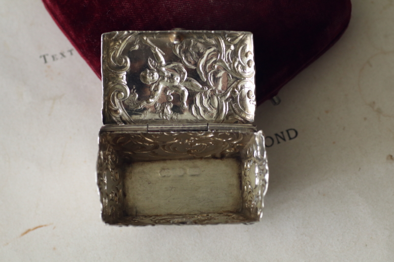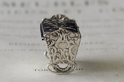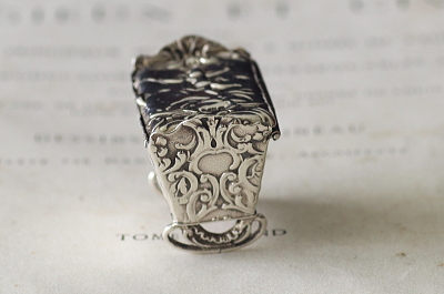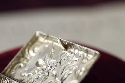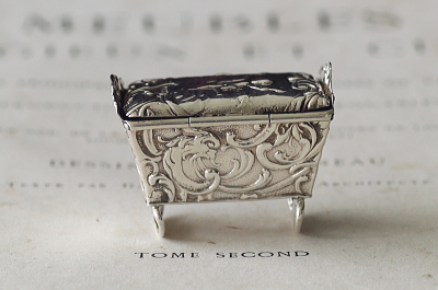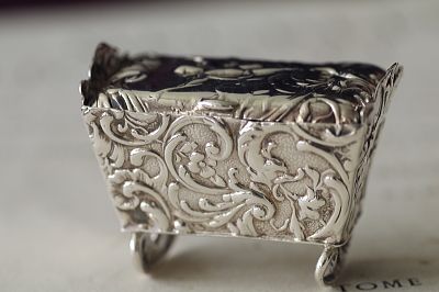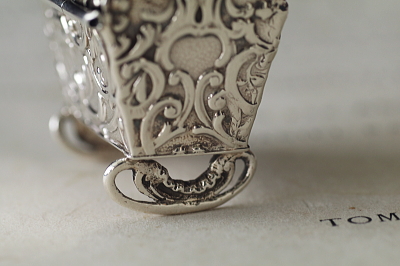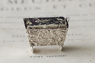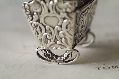 ★A&C15928 ロココの天使 シルバーベビーコット W53,D33,H41mm(39.0g) / ¥36,000.-〔税込み・送料別〕 送料:宅配便送料無料〔3万円以上〕 ◆ご注文方法はこちら◆ シルバーの輝きの中に天使のシルエットが浮かび上がり、四方を優雅なロココ模様で飾られた、華やかなミニチュアベビーコット。ちゃんと揺りかごとして揺れる姿も微笑ましいひと品は、装飾的な銀器で有名なドイツのHanau製。グリム兄弟の街としても有名と聞けば、小さな赤ちゃんの登場する童話もあったかしらと、想像が膨らむ小さなアンティーク。アクセサリーなどの、小物を収められるのも気が利いているポイントです。ホールマークから1898年にドイツからロンドンにインポートされた品と分かる、小さいのに、光を集めて豪華に輝く銀のミニチュア。 特に目立つダメージの見られないきれいなしっかりした状態です。写真のアンティークケースは付属しません。 シルバーのミニチュア、エンジェルヘッズや天使のモチーフのシルバーウェアなどご紹介しています。ページ下部のリンクからご覧ください。 |