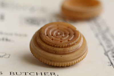 ★A&C15937 ベジタブルアイボリーヴィネグレット Victorian W3×H2cm / 送料:Aランク 【送料ページはこちら】 定形外郵便対応【ご注文時にお申し付けください】 ◆ご注文方法はこちら◆ 細やかな彫刻が施された、ベージュ色の小さな容器。自然なツヤが魅力的なひと品は、ベジタブルアイボリーと呼ばれる硬いヤシの種を彫り上げたもの。ヴィネグレットと呼ばれる気付け薬入れで、社交の場で気分が悪くなったり、めまいを起こしたりした女性が、酢酸など刺激臭のする香料で気付けした、当時の淑女の嗜みとして携行されたアイテムです。19世紀に流行した、上流階級の文化で、銀製の贅沢な品が多いですが、べジタブルアイボリーというのは逆に珍しい存在です。精緻な彫刻で、蓋や内蓋に切ったネジもしっかりした状態で、19世紀から100年以上の時間を過ごしてきた、自然素材の表情が何より魅力的。イギリスから。 内蓋にごく小さな欠けが見られる程度で、内部に匂いなどは無く、全体にきれいなしっかりした状態です。 ベジタブルアイボリーのニードルケースやロザリオケースをご紹介しています。ページ下部のリンクからご覧ください。 |