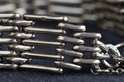★A&C15941 パドロッククラスプ シルバーブレスレット Birmingham 1973 L19cm(19.7g) / ¥25,800.-〔税込み・送料別〕 925シルバー 送料:Aランク 【送料ページはこちら】 ◆ご注文方法はこちら◆ スターリングシルバーのコマを、直線的に組み合わせた、輝きもシャープなブレスレット。それぞれのコマが光を反射する角度を変えて、複雑な輝きを手首にまとえるひと品です。シンプルでモダンなデザインの中、パドロッククラスプの、ハートやクマを思わせるシルエットに可愛らしさが垣間見えます。ホールマークから、1973年のバーミンガム製と分かるイギリスのヴィンテージ。 特に目立つダメージの見られない、きれいなしっかりした状態です。写真のアンティークケースは付属しません。 シルバーブレスレットなど、様々なデザインのブレスレットをご紹介しています。ページ下部のリンクからご覧ください。 |