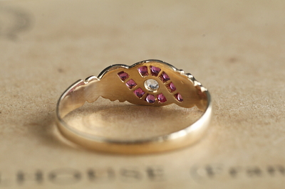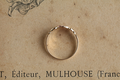 ★A&C15943 ローズカットダイヤモンド&ルビー ヴィクトリアンリング サイズ16号(1.6g) / ¥124,000.- 〔税込み・送料別〕 天然ダイヤモンド / 天然ルビー / K14ゴールド 〔品質保証書付き〕 送料:宅配便送料無料 〔3万円以上〕 ◆ご注文方法はこちら◆ 小粒の色鮮やかなピンクは、この時代のルビー特有の心躍らせる輝きで、ダイヤモンドの周囲を流れるようにたくさん並べられたデザインが、乙女心をくすぐる甘やかな仕上がりです。中央のダイヤモンドにはローズカットが施され、小さいながらオープンセッティングの明るい輝きが、ルビーとの華やかなコントラストを創り出します。ゴールドリングのボリュームも華奢な造りで、19世紀後期のイギリスで愛されたロマンティックが漂うデザインです。 特に目立つダメージの見られないきれいなしっかりした状態です。サイズ直しは有償にて承ります。お気軽にご相談ください。写真のアンティークケースは付属しません。 コンビネーションのアンティークリングをご紹介しています。ページ下部のリンクからご覧ください。 |