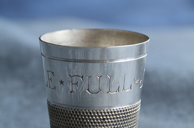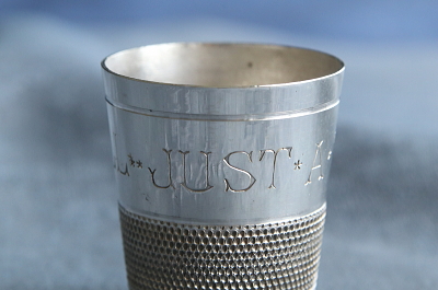 ★A&C15949 ウイスキーショットカップ 「JUST A THHIMBLE FULL」 W3.8,H4.5cm / ¥8,600.-〔税込み・送料別〕 送料:Aランク 【送料ページはこちら】 ◆ご注文方法はこちら◆ シルバープレートの輝きに「JUST A THIMBLE FULL」の文字。随分大きなサイズのシンブルは、シンブル1杯分だけと言いつつ、すり切りで40mlとワンショットのウイスキーがしっかり入る、酒飲みのためのショットカップ。シンブルのコレクターにもお勧めの面白いアンティークは、20世紀前期のイギリスから。 特に目立つダメージの見られない、きれいなしっかりした状態です。 手芸用のシンブルをご紹介しています。ページ下部のリンクからご覧ください。 |