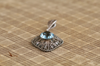 ★A&C15956 シルバーフィリグリー ブルーグラスペンダント 19×39mm(バチカン含む)(2.3g) / ¥19,000.-〔税込み・送料別〕 ガラス / 925シルバー 送料:Aランク 【送料ページはこちら】 定形外郵便対応【ご注文時にお申し付けください】 ◆ご注文方法はこちら◆ ジュエルカットされたブルーのグラスが、シルバーフィリグリーのペンダントの中央で涼しげに輝きます。繊細に銀線を巻いたペンダントは、軽やかでいて輝きにも質の良さを感じさせる、20世紀中期にイギリスに輸入されたヨーロッパ製。特に目立つダメージの見られない、きれいなしっかりした状態です。 ネックレスチェーンは付属せず、ペンダントのみの販売です。 シルバーフィリグリーのアイテムをご紹介しています。ページ下部のリンクからご覧ください。 |