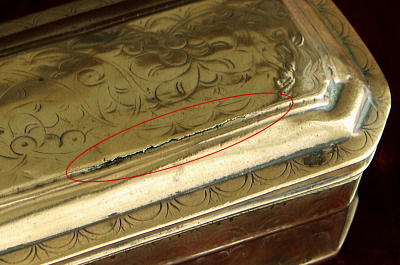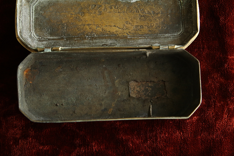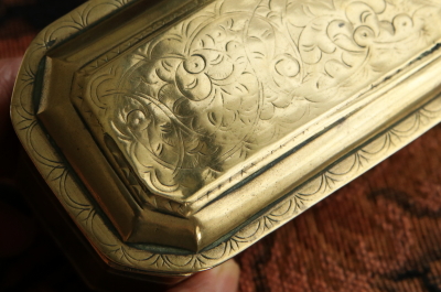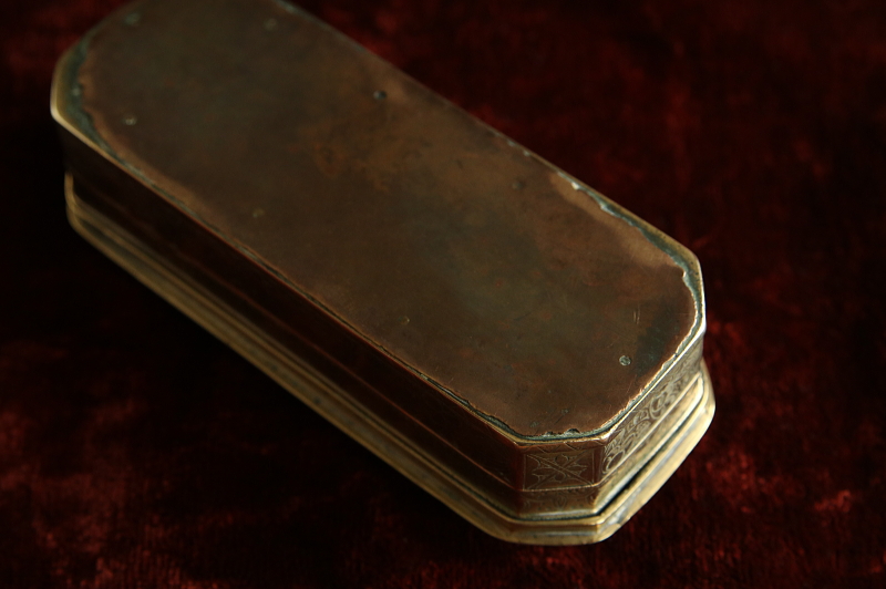 ★A&C15965 花唐草のブラスケース Georgian W15.3,D6.3,H4.3cm / ¥19,800.-〔税込み・送料別〕 送料:Aランク 【送料ページはこちら】 ◆ご注文方法はこちら◆ 真鍮の浅い金色の輝きに、ハンドエングレービングで描かれた花唐草が浮かび上がる、古色を纏うブラスのタバコケース。底を銅板で修繕したり、指がよく触れる部分のエングレービングが薄くなっていたり、200年を超える時間の凄みを感じさせつつ、長年大切に扱ってきたことを偲ばせる、経年の表情が何よりの魅力です。18世紀末から19世紀初頭のイギリス製。 蓋の角などに凹みが幾らか見られます。蓋に1箇所裂けが見られますが、目立ちません。底の穴を銅板で補修しています。銅板はケースの底とリベットのような真鍮の軸で留められているので、端に浮きがありますがしっかり留まっています。 スナッフボックスやマッチケースなどタバコにまつわるアンティークをご紹介しています。ページ下部のリンクからご覧ください。 |