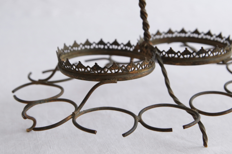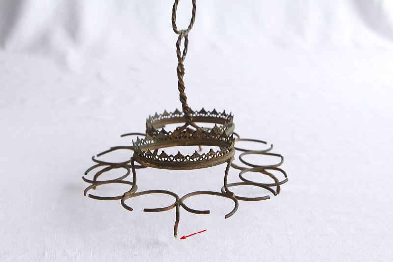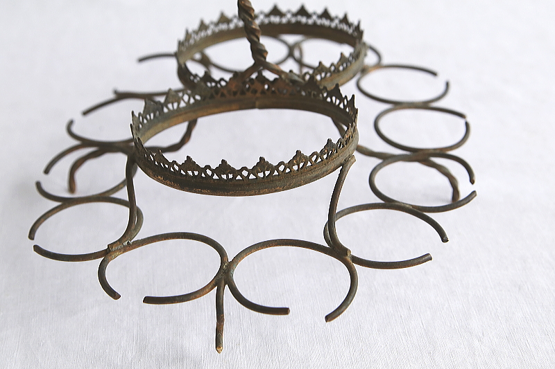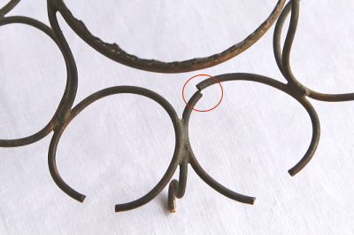 ★A&C15969 リキュールのワイヤースタンド W24,D18,H18cm / ¥3,600.-〔税込み・送料別〕 送料:Aランク 【送料ページはこちら】 ◆ご注文方法はこちら◆ ワイヤーの輪を繋げたり撚り合わせたり、趣深い造形のスタンド。もとはリキュールカラフェとグラスのスタンドだったようですが、渋くくすんだ金色のメタルに味わいがあり、スタンドだけでもディスプレイに活かせそう。19世紀のフランスから。 足に1箇所浮きがあり、少々ガタつきます。グラス用のリング1箇所にワイヤー切れ。それ以外は全体にしっかりしています。 ディスプレイに使えそうなオブジェをご紹介しています。ページ下部のリンクからご覧ください。 |