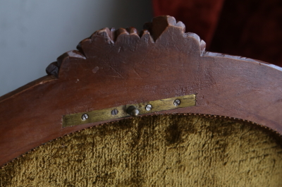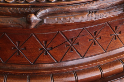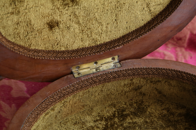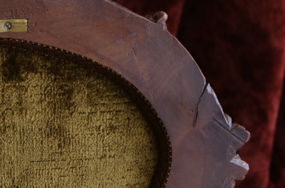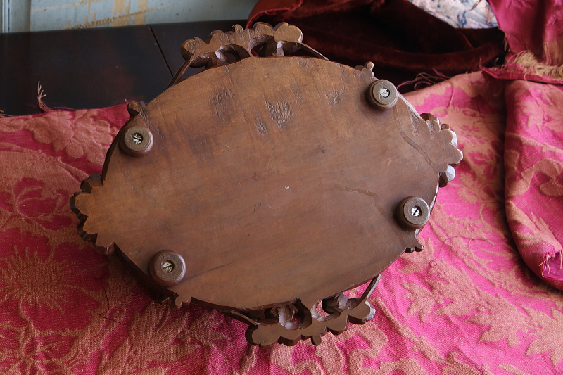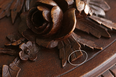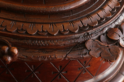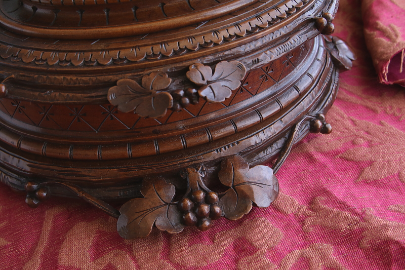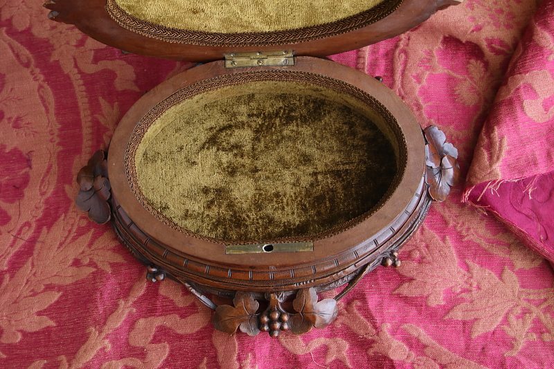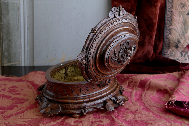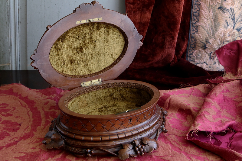 ★A&C15978 薔薇を飾るウォールナットジュエリーケース W33,D27.5,H15cm / 送料:宅配便送料無料〔3万円以上〕 ◆ご注文方法はこちら◆ 天辺に薔薇と花々が飾られた、オーバルの木彫の小箱。小箱と言っても両手でないと持てないほどの堂々とした体躯で、木目の詰まったソリッドウォールナットの重みにも高級感が漂う豪奢な佇まいです。 まずは、蓋に一段盛り上げられた天辺の花々の彫刻に目が行きますが、小作りで女性らしいムードです。オーバルの本体は筒状にくり抜かれた、贅沢なソリッドウォールナットにラティス調の線彫りが愛らしく、底板には縁に蔦の彫刻が、周囲に大きくせり出すように一部は透かし彫りで表現され、足元の広がりが、地に根を張るような、堂々とした安定感で全体を力強くまとめています。 端々に、細かな彫刻が豪華に飾られた作品ですが、彫刻の端に目立たない欠けがいくらか見られる程度で、大きなダメージなく残ったのは非常に幸運でした。内部は当店で、アンティークベルベットを使って張り替えました。1900年頃のフランス製。 彫刻の端にいくらか欠けが見られ、経年の乾燥によるひびが数か所ありますが、大きなダメージはなく、伝統的なアンティーク塗装直しをしていますので、細かなダメージも気にならないと思います。 様々なデザイン、素材のジュエリーボックスをご紹介しています。ページ下部のリンクからご覧ください。 |