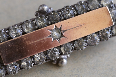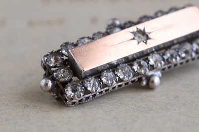 ★A&C15980 ゴールド&シルバー ペーストバーブローチ 40×16mm(5.4g) / ¥19,000.-〔税込み・送料別〕 ガラス / シルバー / 金張り 送料:Aランク 【送料ページはこちら】 ◆ご注文方法はこちら◆ シルバーベースに金張りされたゴールドの輝きと、ペーストの柔らかな煌めきが好対照な、ヴィクトリアンの空気漂うバーブローチ。ダイヤのような瞬きではありませんが、クリアペーストは時代に色づき、深く奥行きのある光を発する、アンティークペーストならではの趣で、四方のシルバーボールが全体を引き締めるように、静かに輝きます。19世紀後期のイギリスから。 刻印はありませんがシルバーベースに、ローカラットゴールドの金張りです(テスト済み)。真ん中のペーストに欠けがありますが、周りのペーストはきれいな状態で、金具もしっかりしています。落下防止にシリコンストッパーをお付けします。写真のアンティークケースは付属しません。 オールドペーストのブローチをご紹介しています。ページ下部のリンクからご覧ください。 |