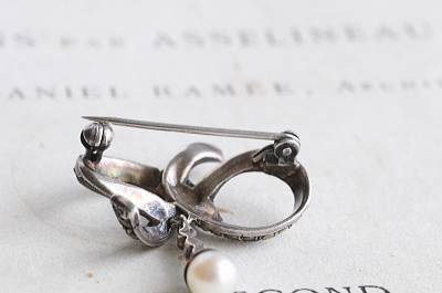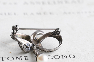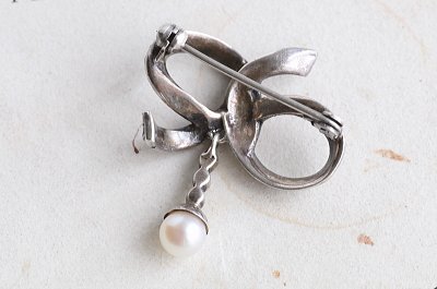 ★A&C15991 パール&マーカサイト シルバーブローチ 29×35mm(5.9g) / ¥22,500.-〔税込み・送料別〕 本真珠 / マーカサイト / シルバー 送料:Aランク 【送料ページはこちら】 ◆ご注文方法はこちら◆ 銀のリボンをくるりと巻くような、結び目からパールのドロップが揺れるシルバーブローチ。いシンプルな結び目に、爪留されたマーカサイトがずらりと並び、輝きのコントラストも際立ちます。直径6ミリのパールの光沢が、全体の輝きに柔らかなアクセントを付けて、硬すぎず甘すぎない、ちょうど良い着け心地を愉しめるひと品です。20世紀中期のヨーロッパ製。 特に目立つダメージの見られないきれいなしっかりした状態です。写真のアンティークケースは付属しません。 結び目やリボンモチーフのぶろーちをご紹介しています。ページ下部のリンクからご覧ください。 |