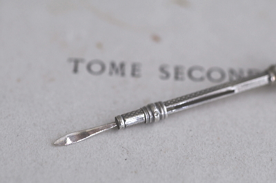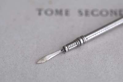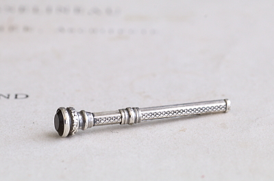 ★A&C15997 シーリングスタンプ&シルバートゥースピック W7,L42~55mm(1.5g) / ¥14,500.-〔税込み・送料別〕 ガラス / シルバー 送料:Aランク 【送料ページはこちら】 定形外郵便対応【ご注文時にお申し付けください】 ◆ご注文方法はこちら◆ ガーネットを模した、深く赤い色ガラスを末端にそなえた、シルバー製の小さなスティック。スライド式でトゥースピックがせり出す、贅沢な素材やデザインが目を惹く、紳士淑女の身嗜みの道具です。シーリングスタンプ兼用のシルバートゥースピックは、古き良き時代に思いを馳せる道具として、19世紀当時ののままに作られた、20世紀中期のヴィンテージです。イギリスから。刻印はありませんが、テスト済みのシルバー製。 ガラスのエッジに引っかかり程度の欠けが見られますがほとんど気にならないと思います。トゥースピック先端に僅かな歪みが見られますが、それ以外には目立つダメージの見られない、きれいな状態です。 シルバートゥースピックやスウィズルスティックをご紹介しています。ページ下部のリンクからご覧ください。 |