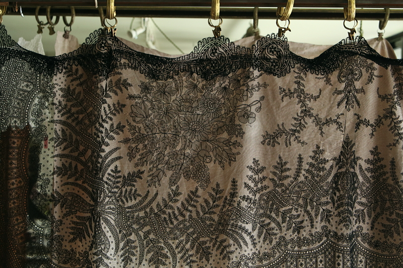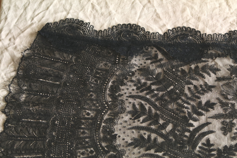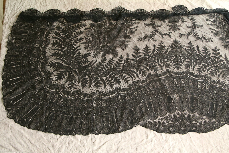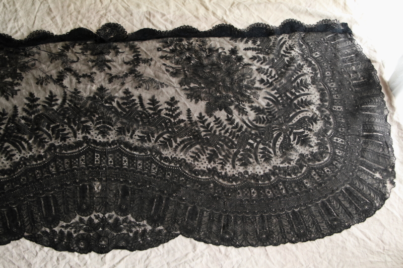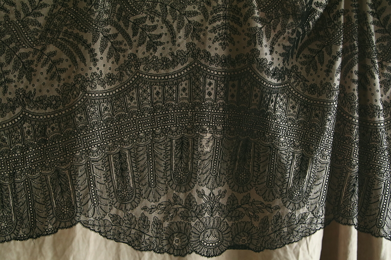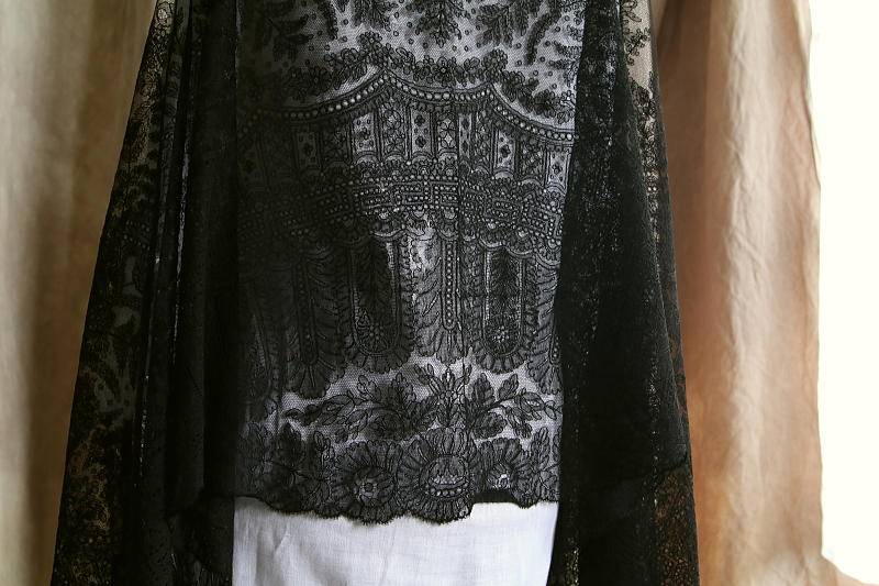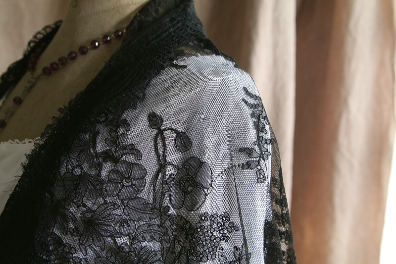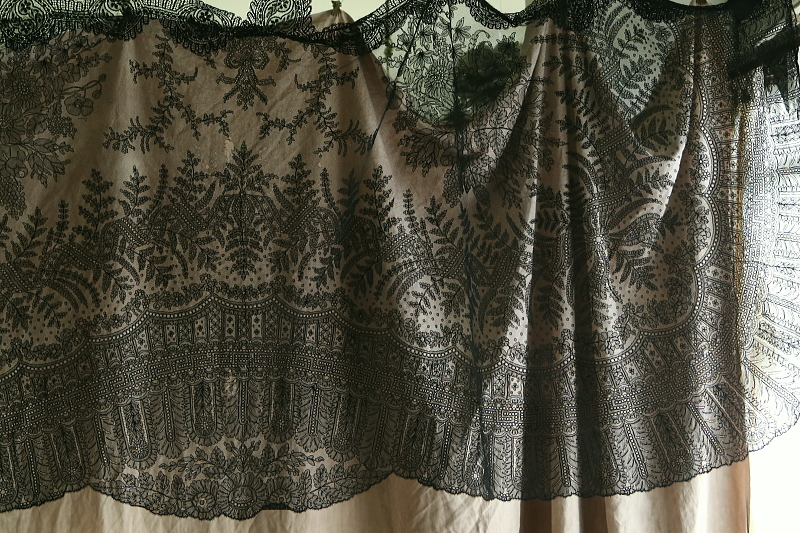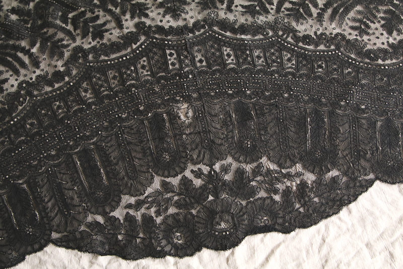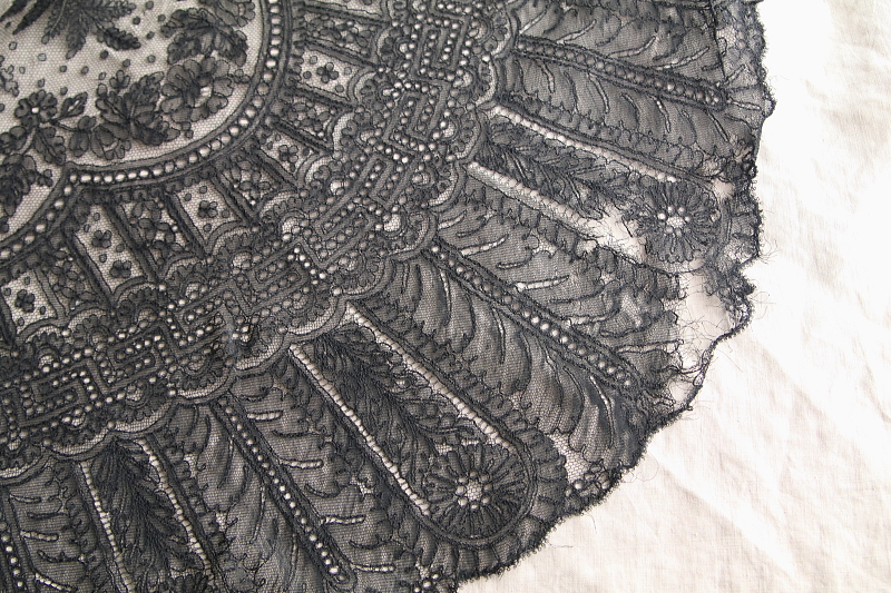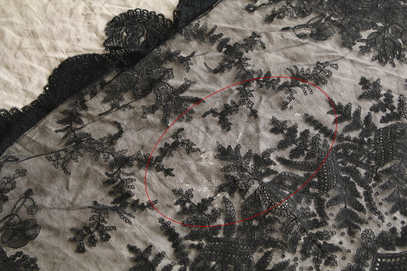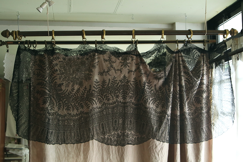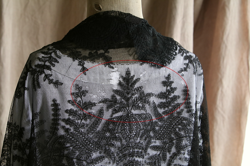 ★A&C15998 ヴィクトリアン ブラックチュールレースショール W190×H80cm / 送料:Aランク 【送料ページはこちら】 ◆ご注文方法はこちら◆ たっぷりとしたチュールレースをキャンバスに、渋く華やかな花模様を描く一枚。当時好まれたシダや古典的な手の込んだ装飾模様が、隆盛を極めた時代を思わせます。大人の為の花模様として愉しみたい、19世紀ヴィクトリア時代のイギリスの品。おそらくシルクだと思われます。デリケートなチュールレースの宿命ですが、穴やほつれが少なからず見られますが、大判の古いチュールレースが原型を留めて残っているのは、今や希少な存在です。絵柄の優雅さをご堪能下さい。 (状態については、出来る限り注意深く確認しておりますが、見つけきれなかった小さな染み、薄い染み、僅かな糸切れ等、目立たない小さなダメージがあることもございます。何卒ご容赦ください。) 黒いシルクのケープをご紹介しています。ページ下部のリンクからご覧ください。 |