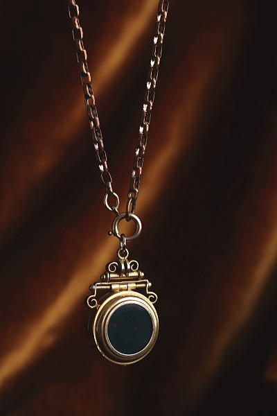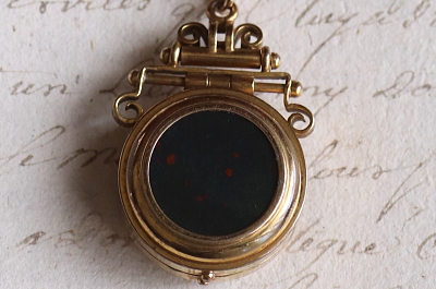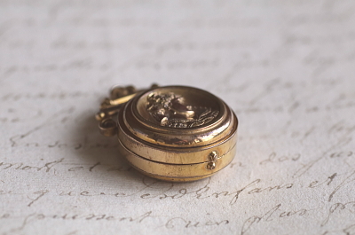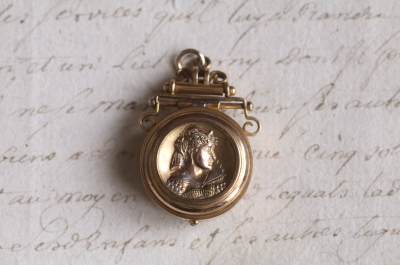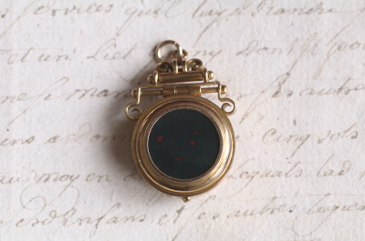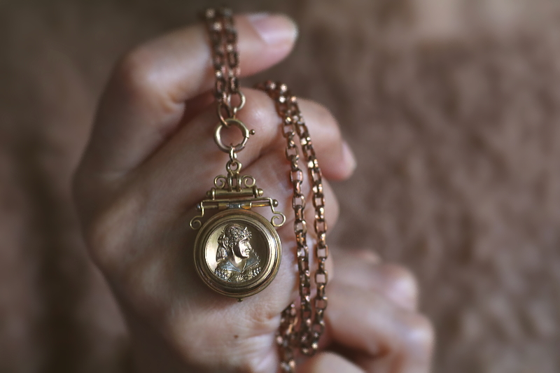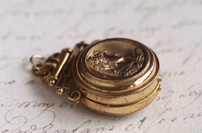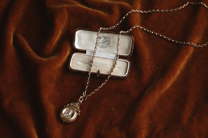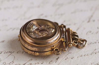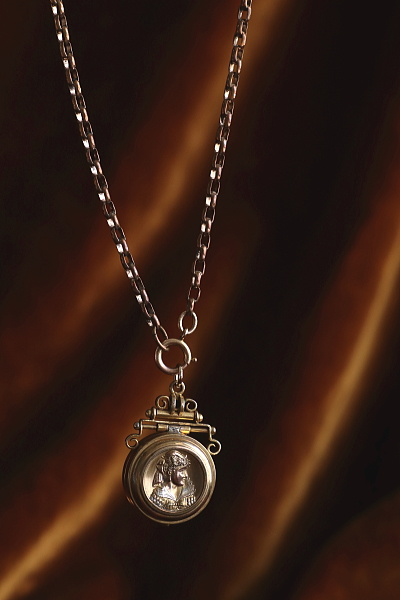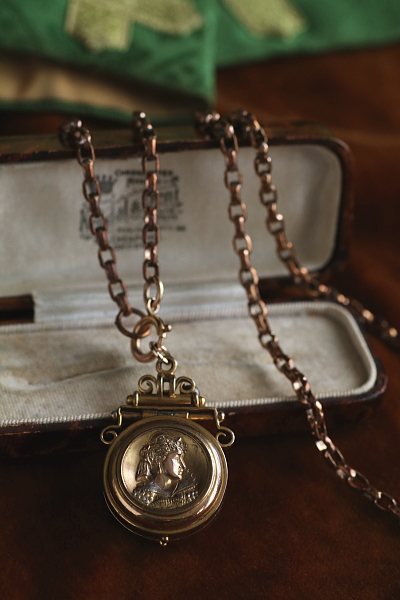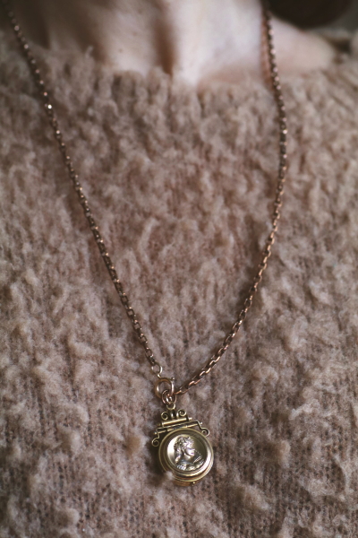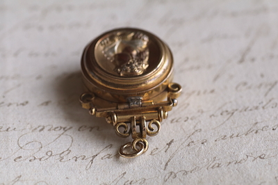 ★A&C16004 ヴィクトリアン ロケットペンダント 24×38mm(丸カン含む)(12.4g) / ¥36,800.-〔税込み〕 天然ブラッドストーン / ガラス / 合金 送料:宅配便送料無料〔3万円以上〕 ◆ご注文方法はこちら◆ 貴婦人の横顔が、経年の落ち着いた輝きに浮かび上がる、ボリュームのあるロケットペンダント。豪華な衣装を纏った威厳のある横顔は、王族か貴族のものでしょう、裏面にはブラッドストーンの、自然石ならではの重みある光沢を愉しめるひと品。11ミリと厚みのあるフレームを開くと、両面にガラスカバーで守られたフォトフレームが現れる、ヴィクトリア時代ならではのロマンティックなアクセサリーです。凝った作りの金具からも、古き良き時代を感じられる、19世紀の英国の品です。 表面のレリーフ中央にゆるやかに凹みが見られます。それ以外は目立つダメージのないきれいなしっかりした状態です。チェーンは付属せず、ペンダントトップのみの販売です。 ロケットペンダントをご紹介しています。ページ下部のリンクからご覧ください。 |