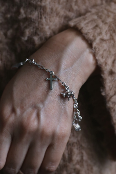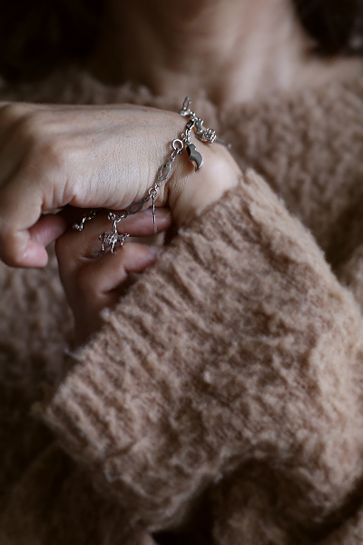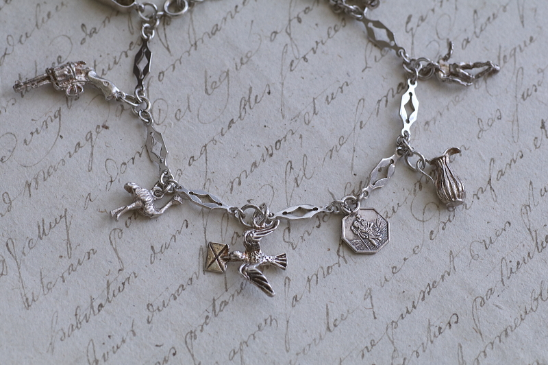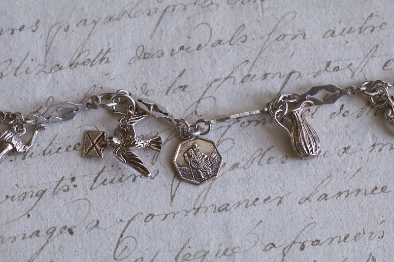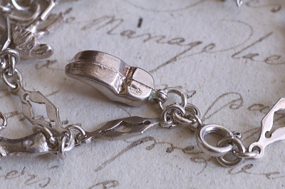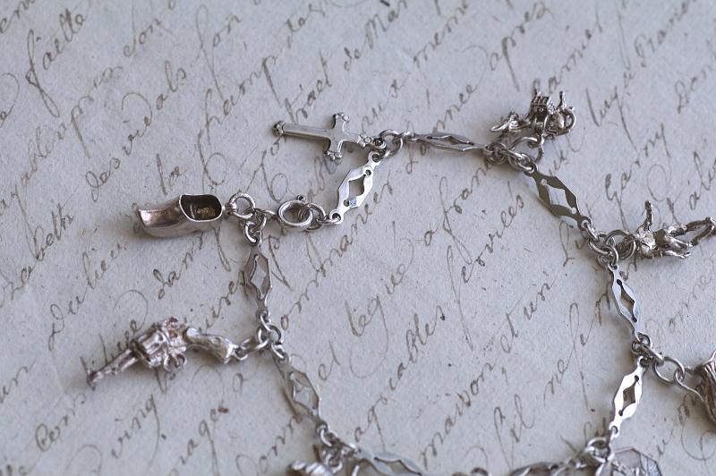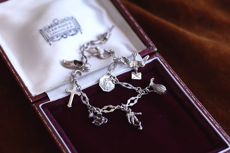 ★A&C16007 9シルバーチャームブレスレット 19.5cm(12.9g) / ¥23,800.-〔税込み・送料別〕 シルバー 送料:Aランク 【送料ページはこちら】 ◆ご注文方法はこちら◆ 凝ったデザインのシルバーチェーンに、9個のシルバーチャームが飾られたブレスレット。手紙を運ぶツバメや、聖クリストフォロスのメダイがやはり目を引きますが、ロバやダチョウなど動物や、木靴やジャグなどの道具類までぶらさげます。サッカー選手や短銃などちょっと珍しいものも面白い、可愛らしいアクセサリーです。軽やかな着け心地のシルバーの重みも心地よい、20世紀中頃のイギリスのヴィンテージ。 チェーンに刻印はありませんが、テスト済みのシルバー製。十字架はシルバーではありません。それ以外のチャームはスターリングシルバーのメダイや、835シルバーの木靴など刻印のあるものもありますが、刻印のないものもテスト済みのシルバー製です。 シルバーのブレスレットをご紹介しています。ページ下部のリンクからご覧ください。 |