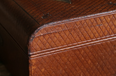 ![]() レザーにキズやシミが見られます。鍵は無くなっているので、蓋は固定しません。 |