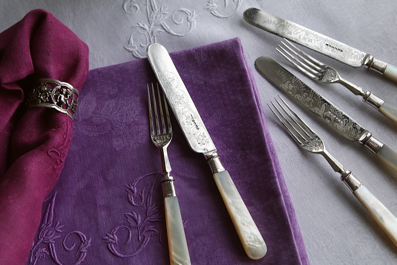 ★A&C16038 マザーオブパールハンドル デザートナイフ&フォーク Victorian A&C16038-A~D: ナイフ:L20.5cm フォーク:L16.8cm / 各¥8,600.-〔税込み・送料別〕(C,D sold) A&C16038-E,F:(ハンドルにヒビ、染み) ナイフ:L20.5cm フォーク:L16.8cm / 各¥7,600.-〔税込み・送料別〕 送料:Aランク 【送料ページはこちら】 ◆ご注文方法はこちら◆ ナイフのブレードとフォークの先にも蔓草のエングレービングを散りばめた、ヴィクトリア時代の古式ゆかしいスタイルのデザートナイフ&フォーク。シルバープレートのブレードに細やかに掘り上げた蔓草模様と、ボリューム感のある白蝶貝の滑らかな手触りが嬉しく、手にして使って満足感が得られるデザートカトラリーです。ジョイント部分はシルバー製で、ホールマークから、1891~93年のイギリス、シェフィールド製。華やかなりし時代を偲ばせる19世紀末、ヴィクトリア時代のカトラリーです。 何れもシルバープレート表面やブレードエッジに傷が幾らか残りますが、磨き上げた清潔感のあるきれいな状態です。ブレードとハンドルをニカワで接着していると思われます。湯水に長時間浸けたり煮沸すると、ニカワが溶けますので注意して下さい。食洗機不可。 マザーオブパールやアイボリーハンドルのデザートカトラリーをご紹介しています。ページ下部のリンクからご覧ください。 |