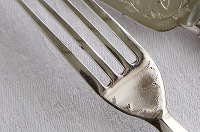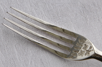 ![]() フォークのハンドル(表)にヒビとシミ。 |